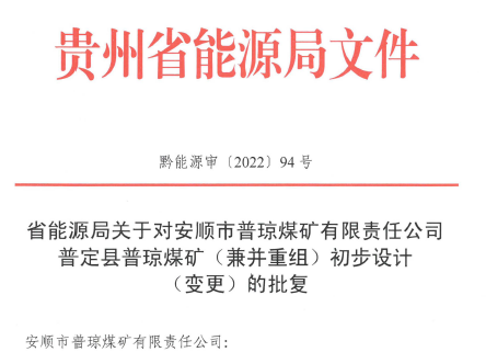 安順市普瓊煤礦有限責(zé)任公司普定縣普瓊煤礦(兼并重組)初步設(shè)計(jì)(變更)