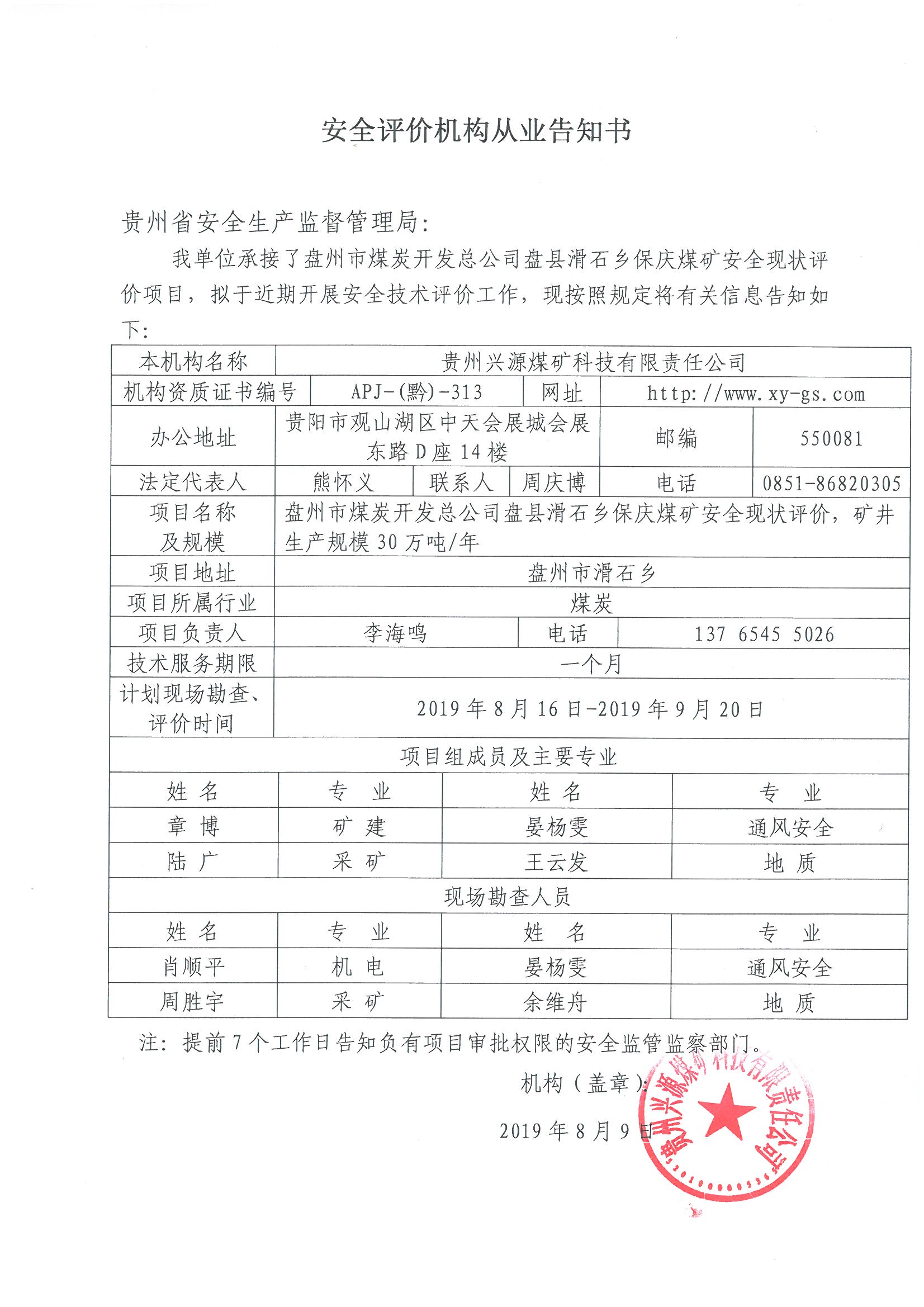 安全評(píng)價(jià)機(jī)構(gòu)從業(yè)告知書[盤州市煤炭開發(fā)總公司盤縣滑石鄉(xiāng)保慶煤礦]