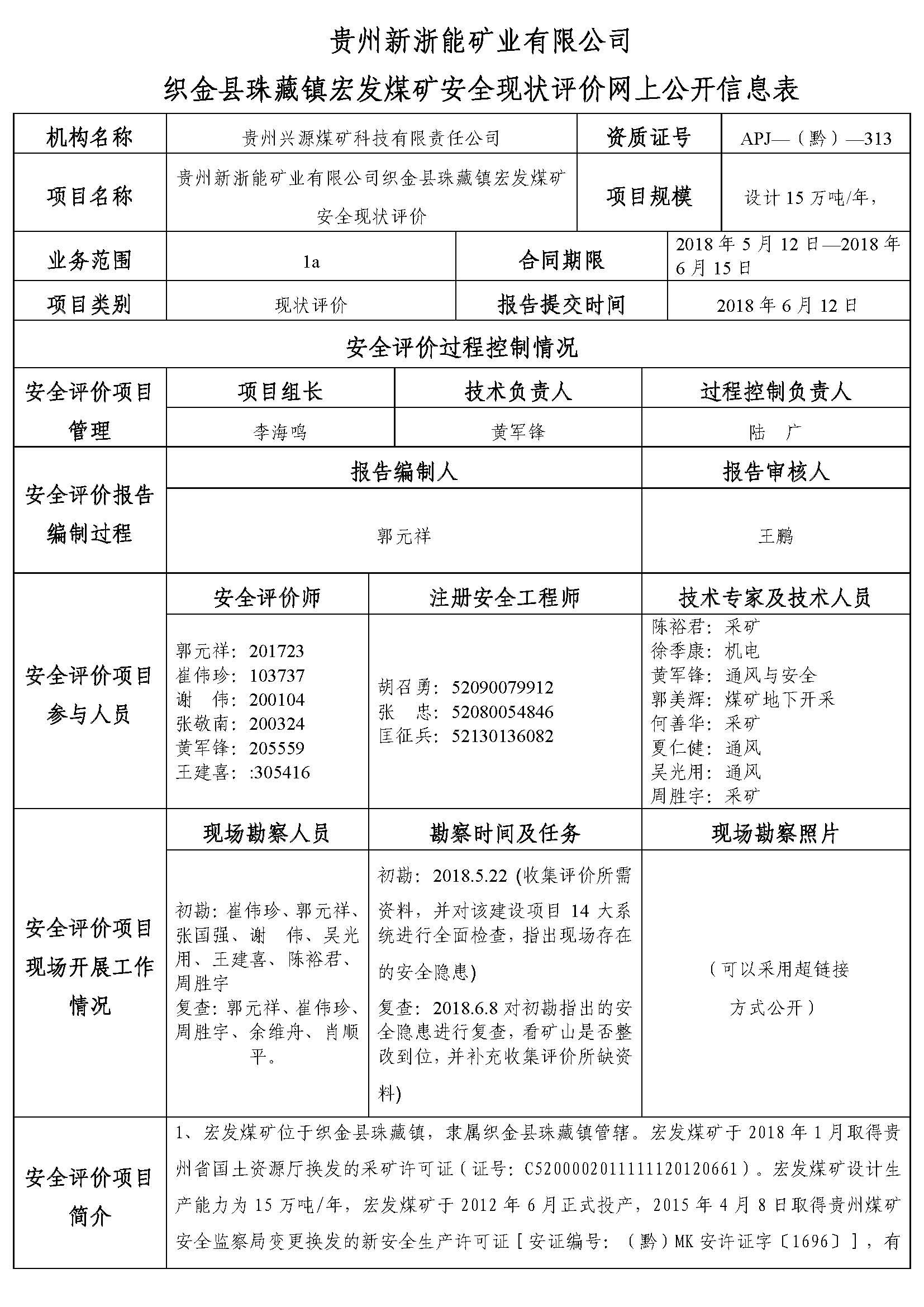 貴州新浙能礦業(yè)有限公司織金縣珠藏鎮(zhèn)宏發(fā)煤礦安全現(xiàn)狀評(píng)價(jià)網(wǎng)上公開信息表