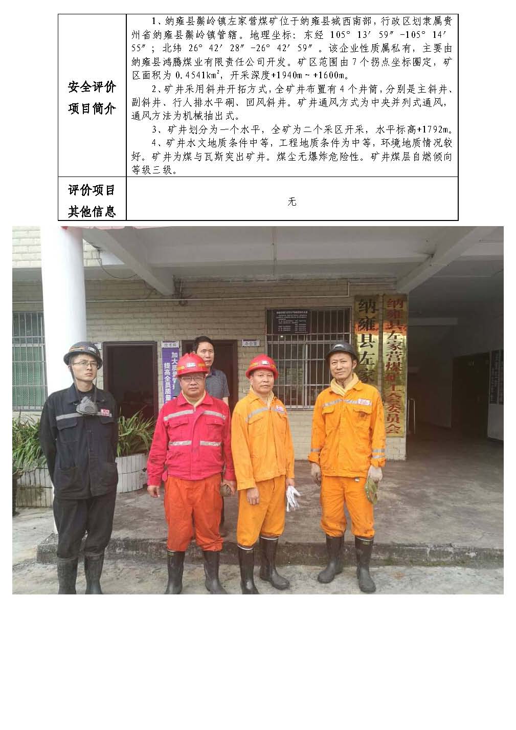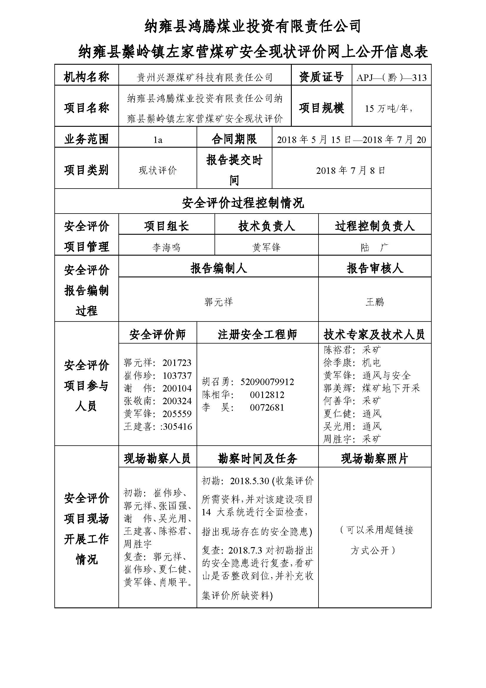 納雍縣鴻騰煤業(yè)投資有限責(zé)任公司納雍縣鬃嶺鎮(zhèn)左家營(yíng)煤礦安全現(xiàn)狀評(píng)價(jià)網(wǎng)上公開信息表