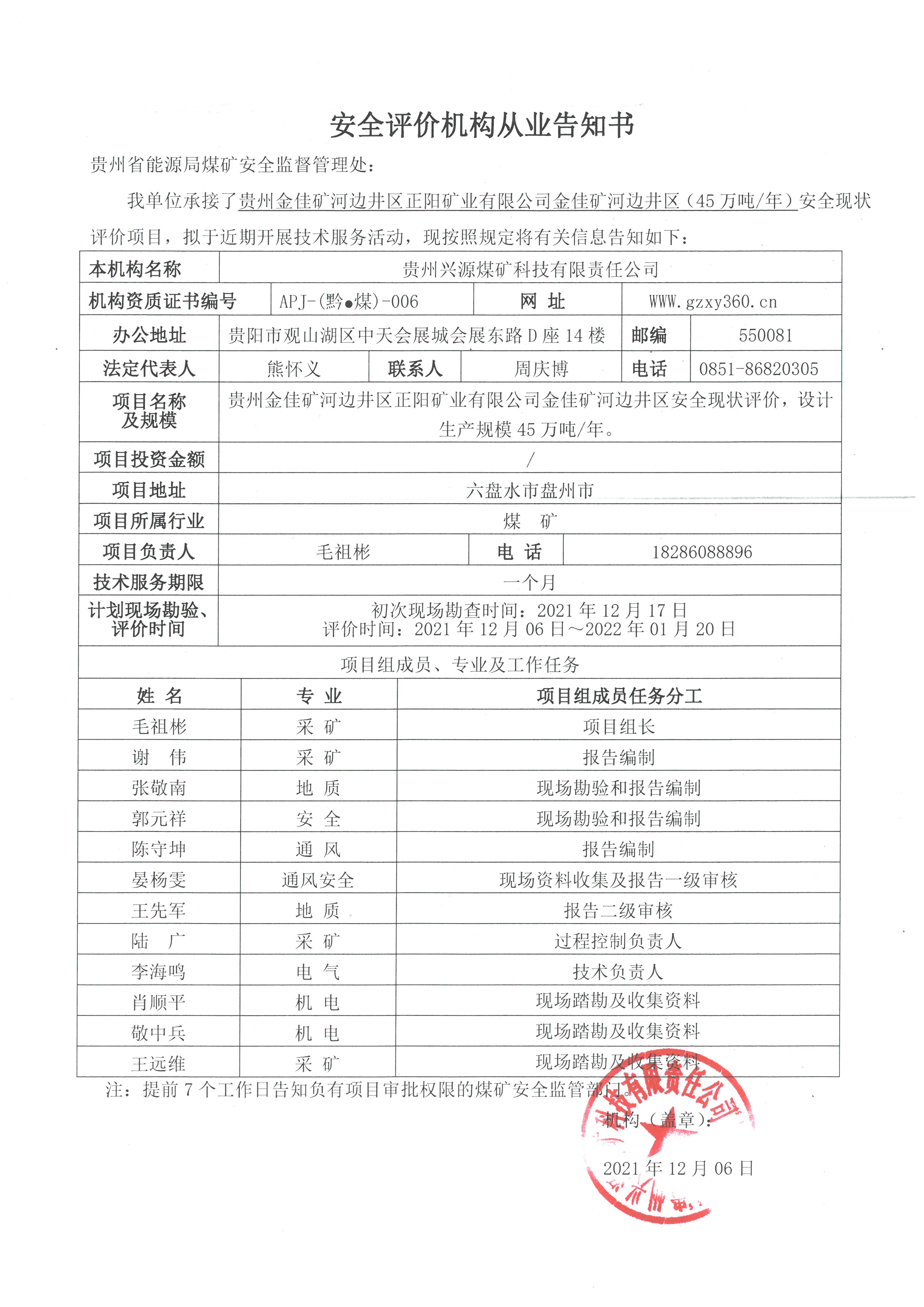 安全評(píng)價(jià)機(jī)構(gòu)從業(yè)告知書(shū)(貴州金佳礦河邊井區(qū)正陽(yáng)礦業(yè)有限公司金佳礦河邊井區(qū)(45萬(wàn)噸/年)安全現(xiàn)狀評(píng)價(jià))