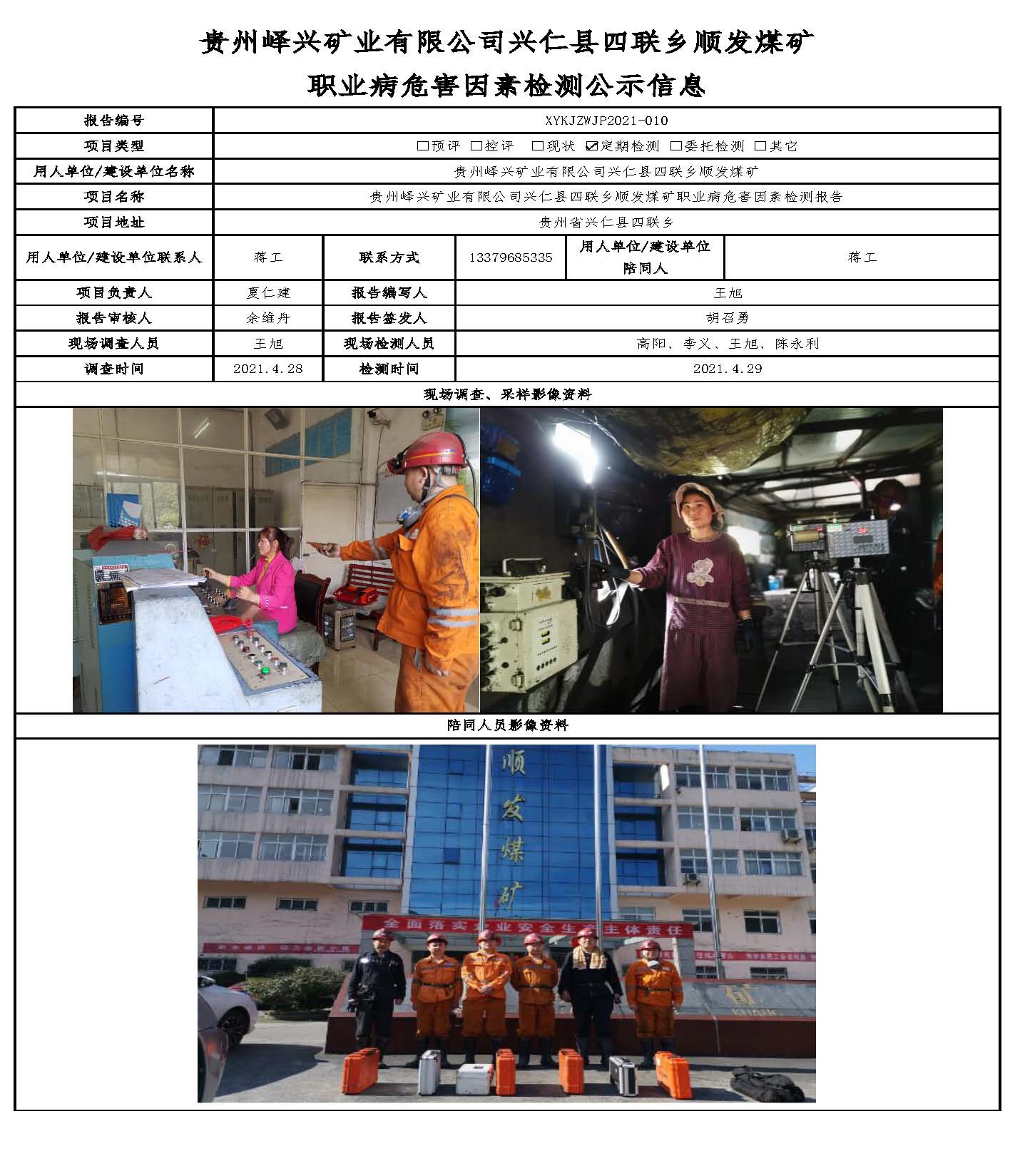 貴州嶧興礦業(yè)有限公司興仁縣四聯(lián)鄉(xiāng)順發(fā)煤礦 職業(yè)病危害因素檢測(cè)公示信息