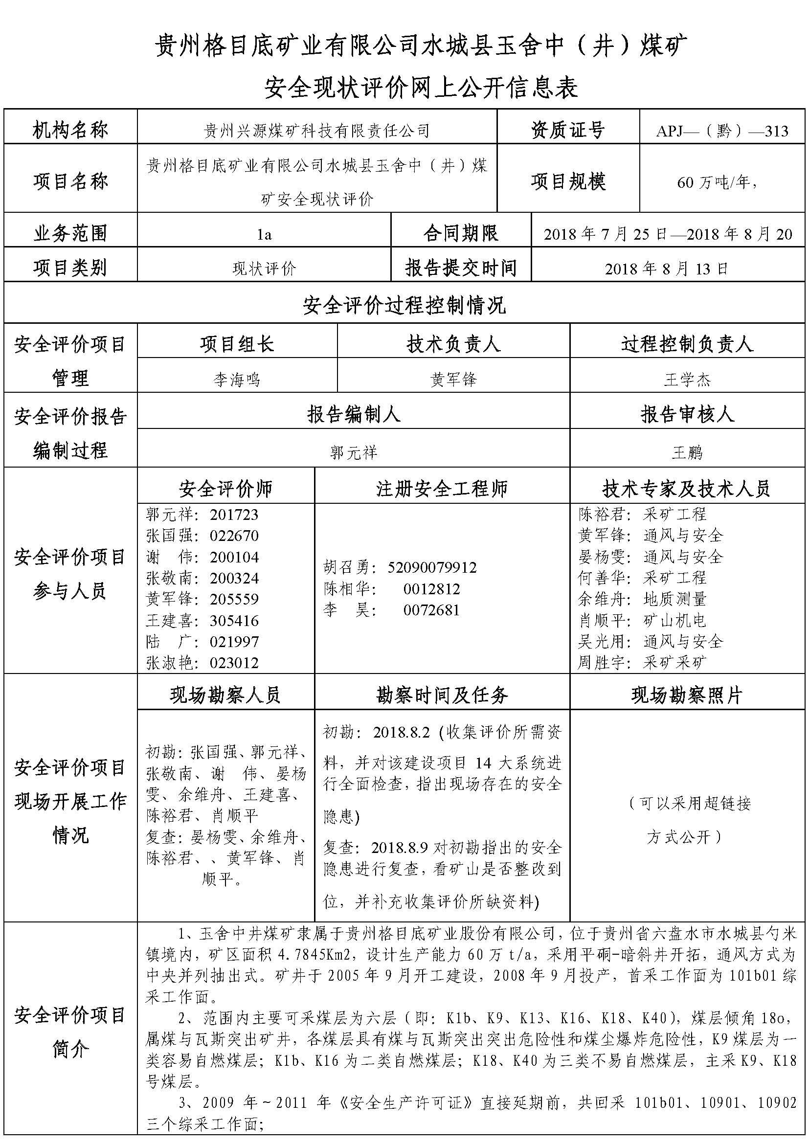貴州格目底礦業(yè)有限公司水城縣玉舍中(井)煤礦安全現(xiàn)狀評(píng)價(jià)網(wǎng)上公開(kāi)信息表