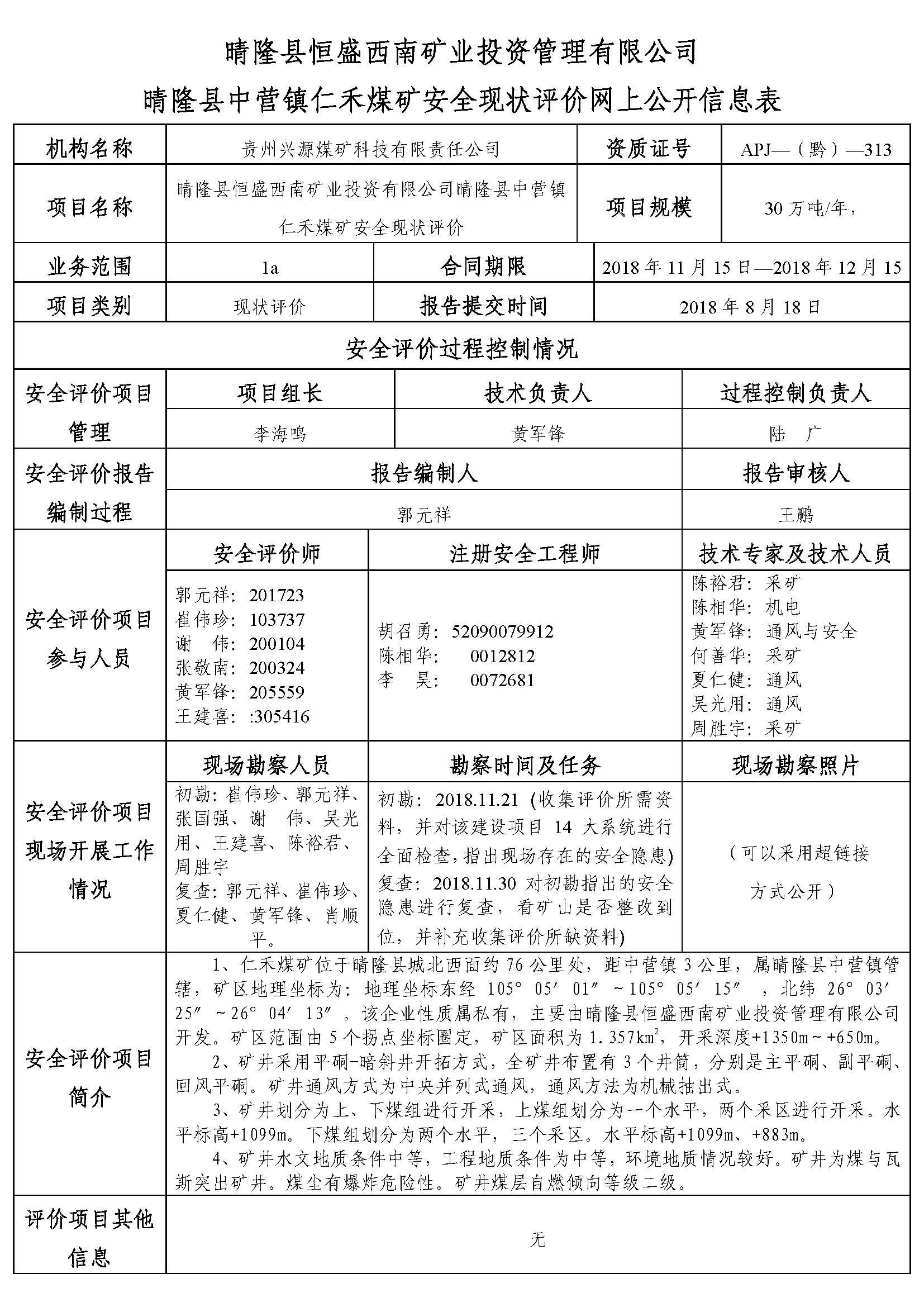 晴隆縣恒盛西南礦業(yè)投資管理有限公司晴隆縣中營(yíng)鎮(zhèn)仁禾煤礦安全現(xiàn)狀評(píng)價(jià)網(wǎng)上公開(kāi)信息表