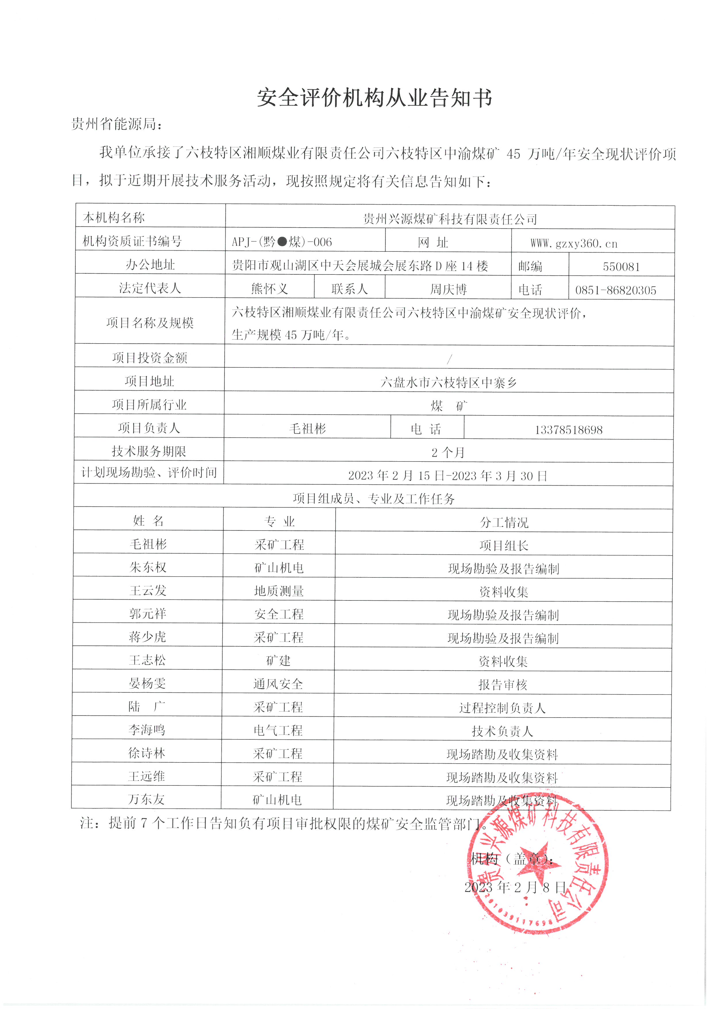 安全評(píng)價(jià)機(jī)構(gòu)從業(yè)告知書【六枝特區(qū)湘順煤業(yè)有限責(zé)任公司六枝特區(qū)中渝煤礦】