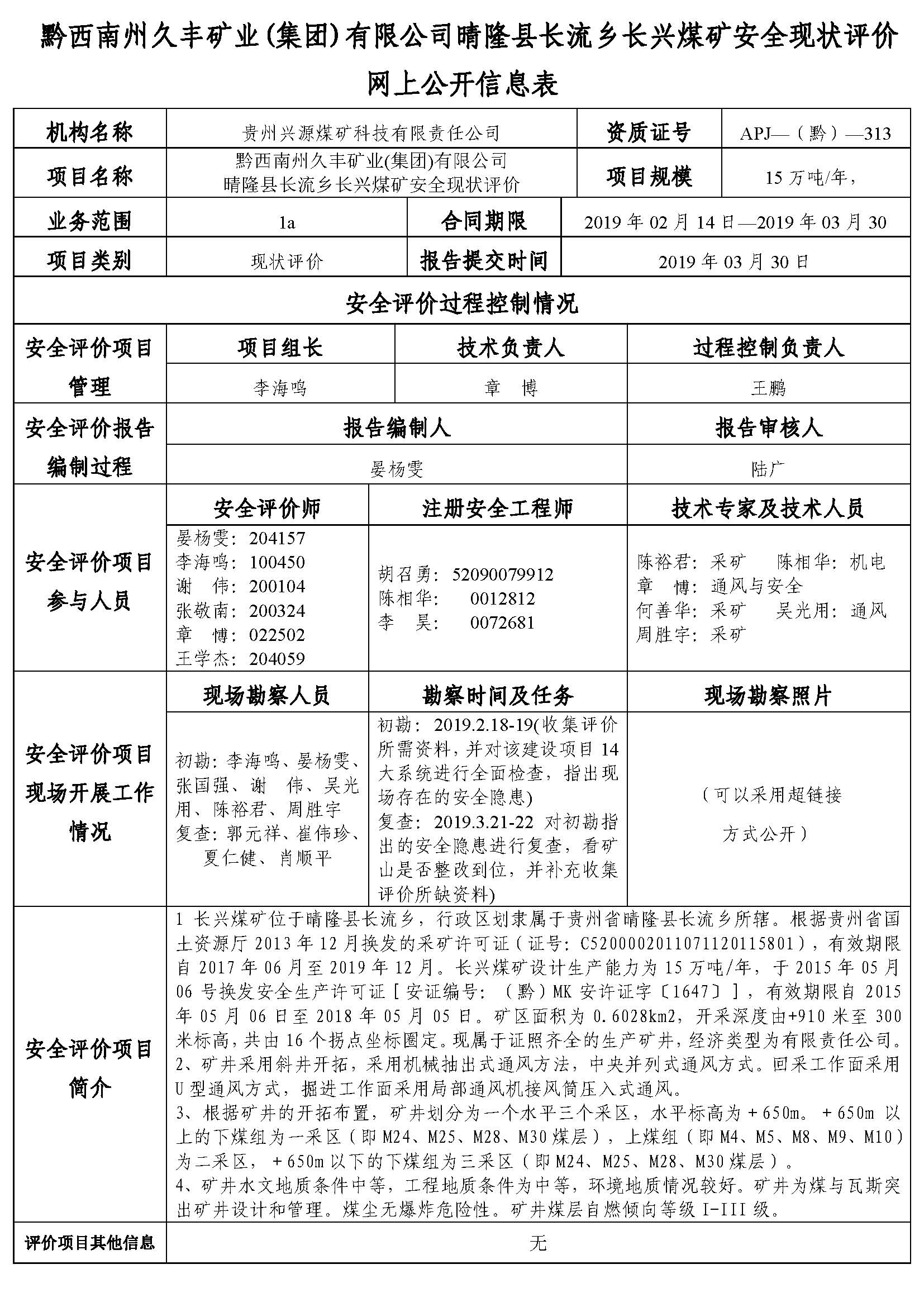 黔西南州久豐礦業(yè)(集團(tuán))有限公司晴隆縣長流鄉(xiāng)長興煤礦安全現(xiàn)狀評價(jià)網(wǎng)上公開信息表