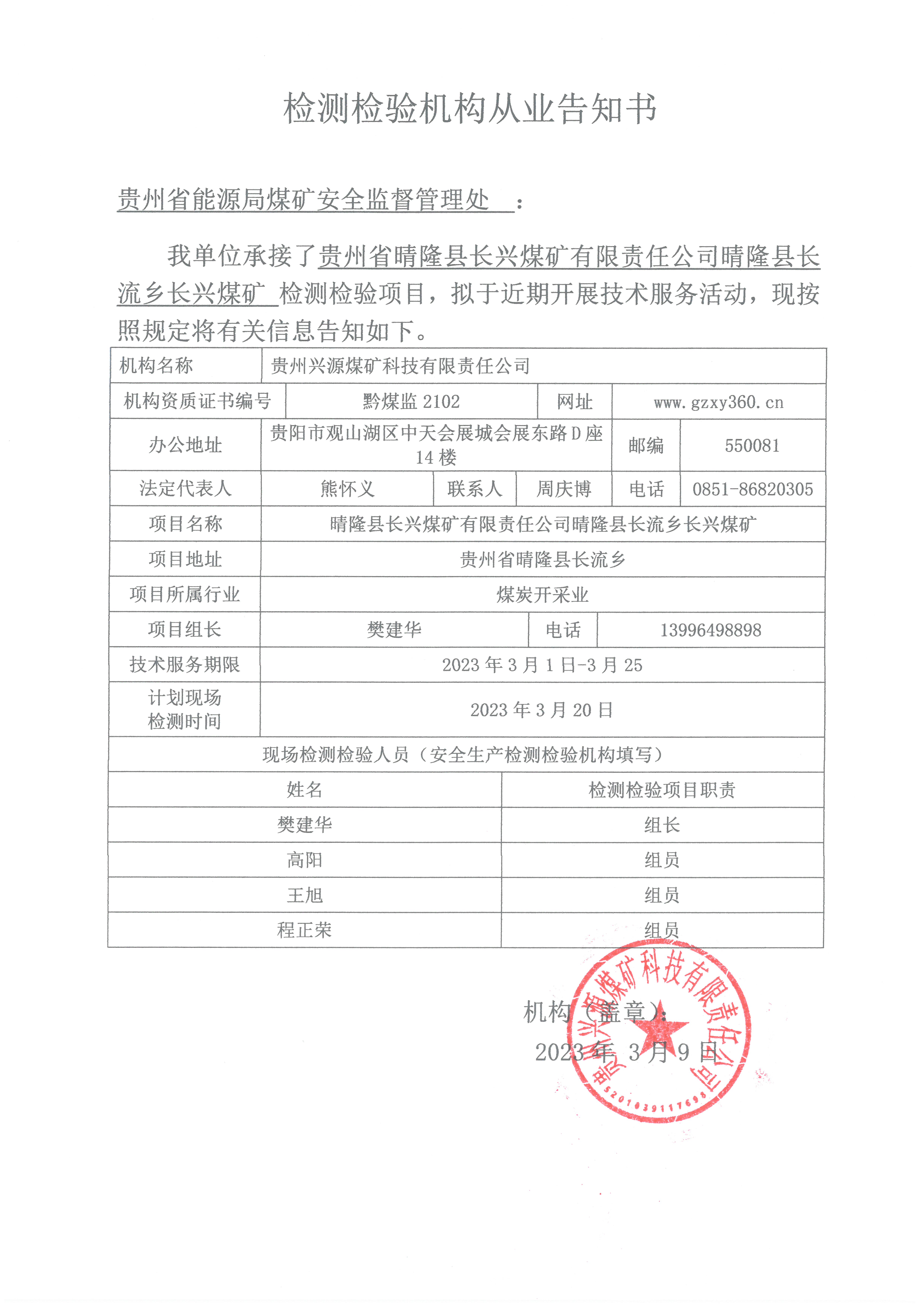 檢測檢驗(yàn)機(jī)構(gòu)從業(yè)告知書【貴州省晴隆縣長興煤礦有限責(zé)任公司晴隆縣長流鄉(xiāng)長興煤礦】