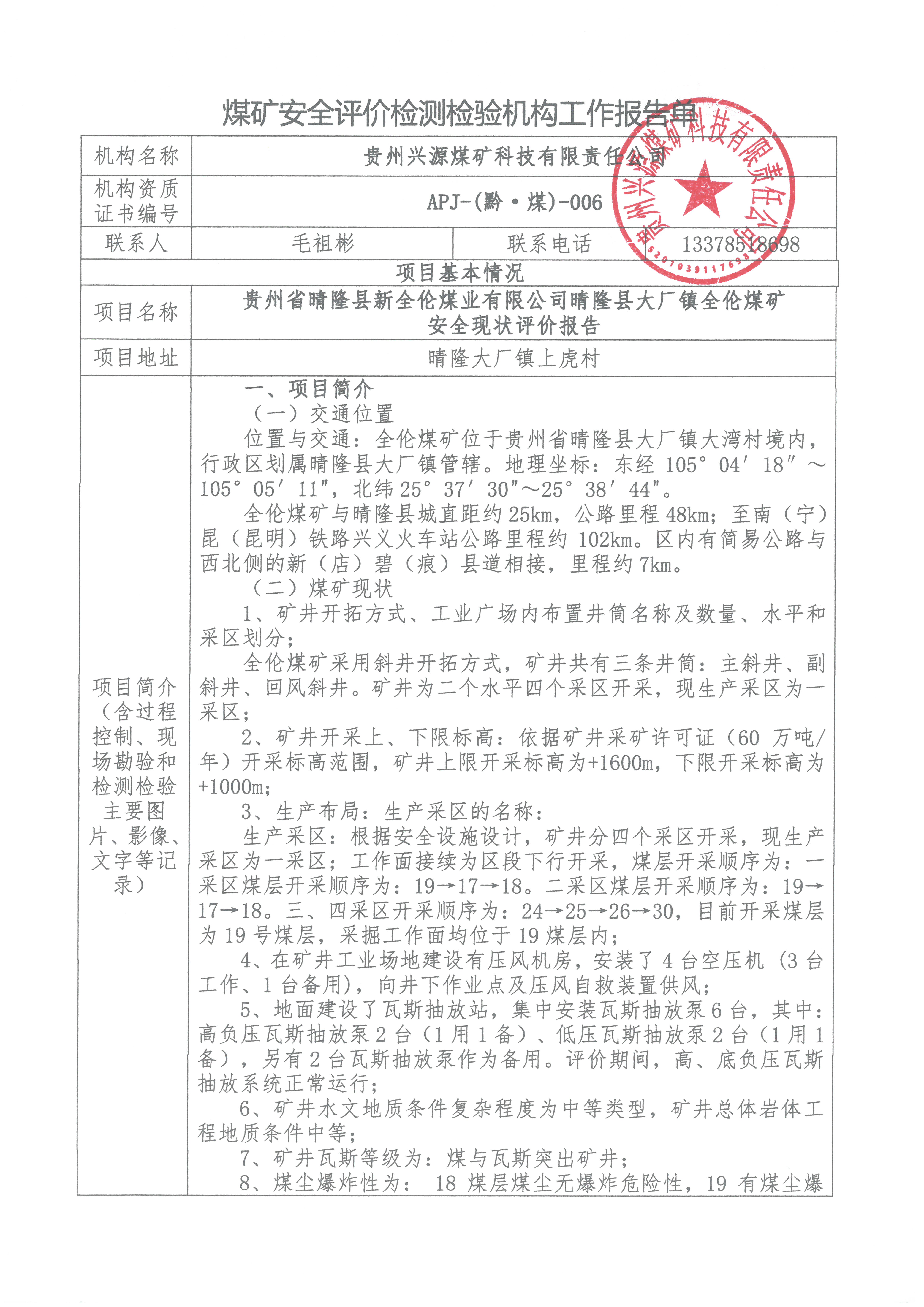 煤礦安全評價檢測檢驗機構(gòu)工作報告單【貴州省晴隆縣新全倫煤業(yè)有限公司晴隆縣大廠鎮(zhèn)全倫煤礦 安全現(xiàn)狀評價報告】