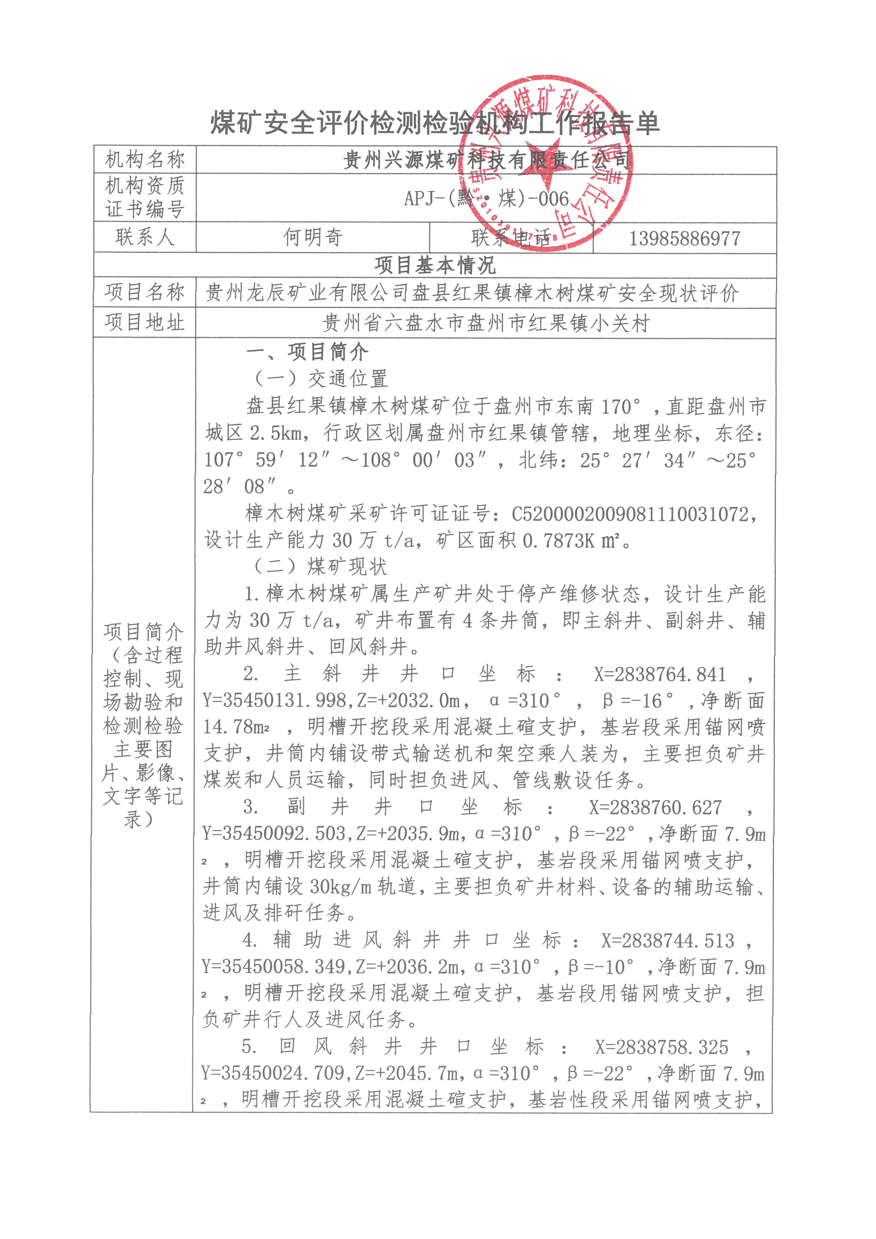 煤礦安全評價檢測檢驗機構(gòu)工作報告單【貴州龍辰礦業(yè)有限公司盤縣紅果鎮(zhèn)樟木樹煤礦安全現(xiàn)狀評價】