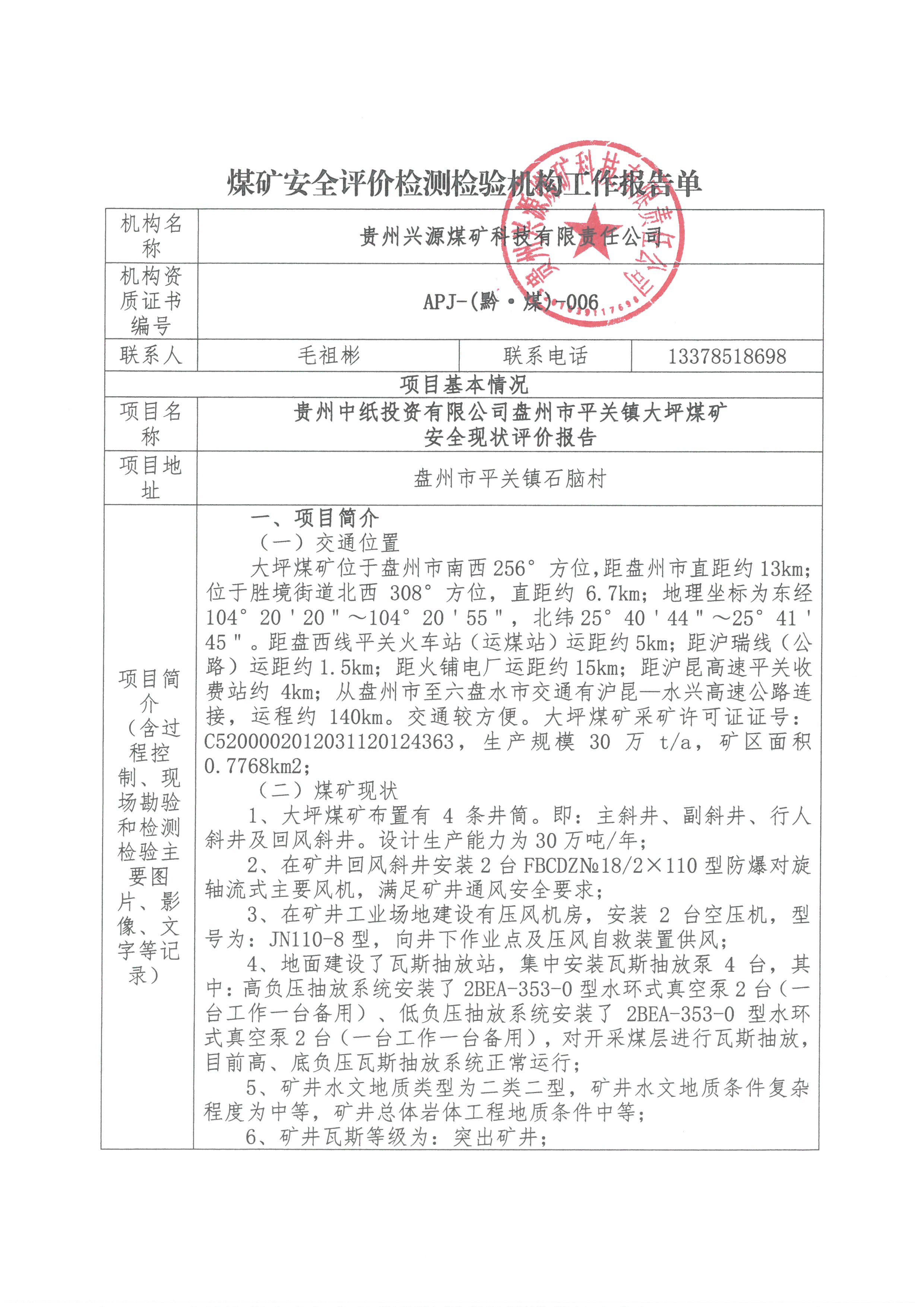 煤礦安全評(píng)價(jià)檢測(cè)檢驗(yàn)機(jī)構(gòu)工作報(bào)告單【貴州中紙投資有限公司 盤州市平關(guān)鎮(zhèn)大坪煤礦 安全現(xiàn)狀評(píng)價(jià)報(bào)告】