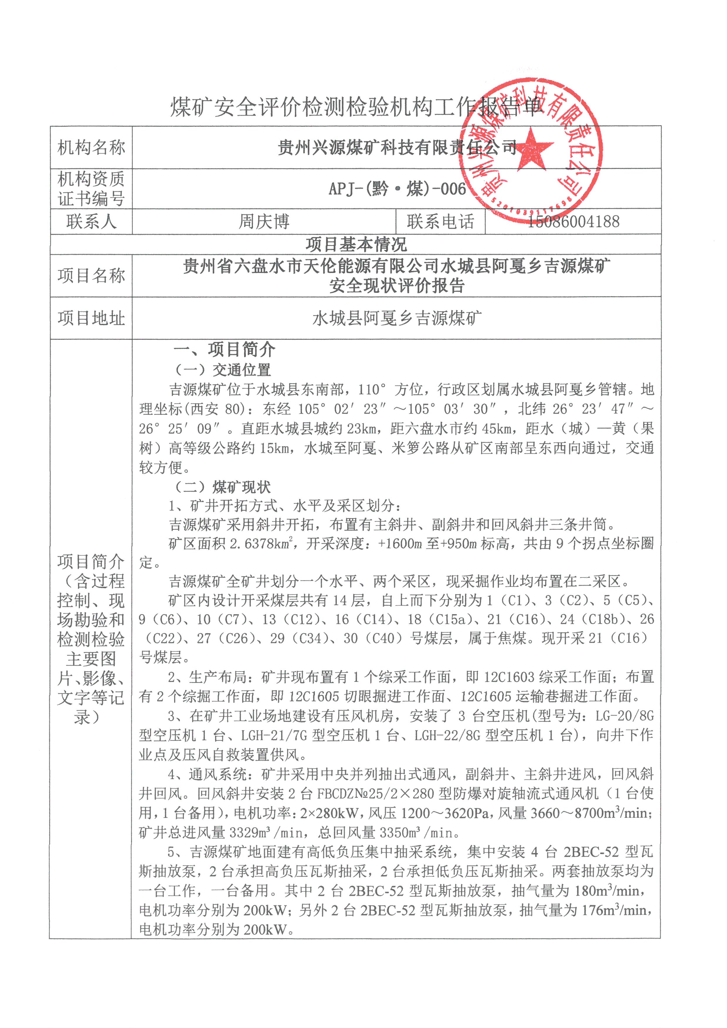 煤礦安全評(píng)價(jià)檢測(cè)檢驗(yàn)機(jī)構(gòu)工作報(bào)告單(貴州省六盤(pán)水市天倫能源有限公司水城縣阿戛鄉(xiāng)吉源煤礦安全現(xiàn)狀評(píng)價(jià)報(bào)告)