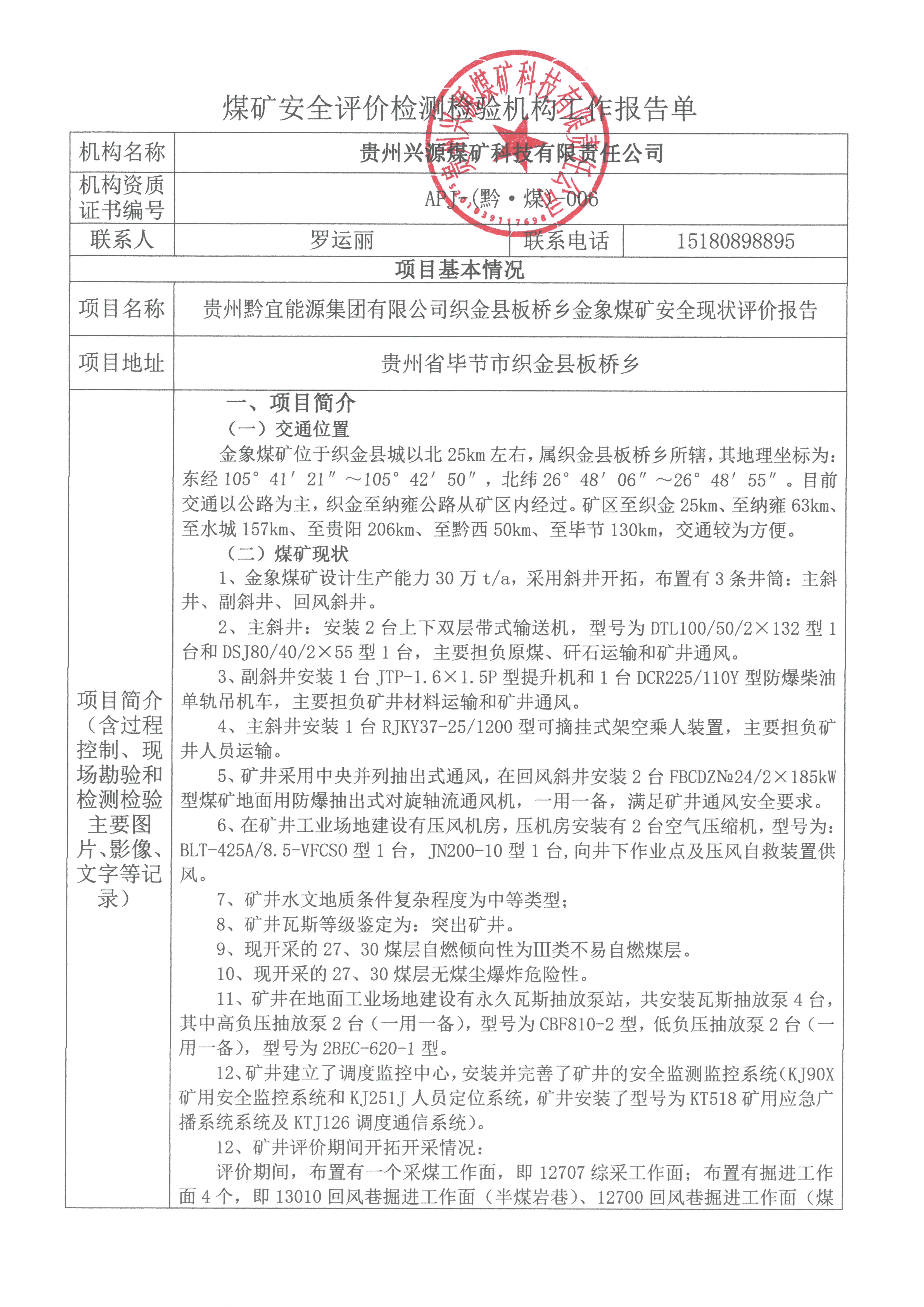 煤礦安全評(píng)價(jià)檢測(cè)檢驗(yàn)機(jī)構(gòu)工作報(bào)告單【貴州黔宜能源集團(tuán)有限公司織金縣板橋鄉(xiāng)金象煤礦安全現(xiàn)狀評(píng)價(jià)報(bào)告】