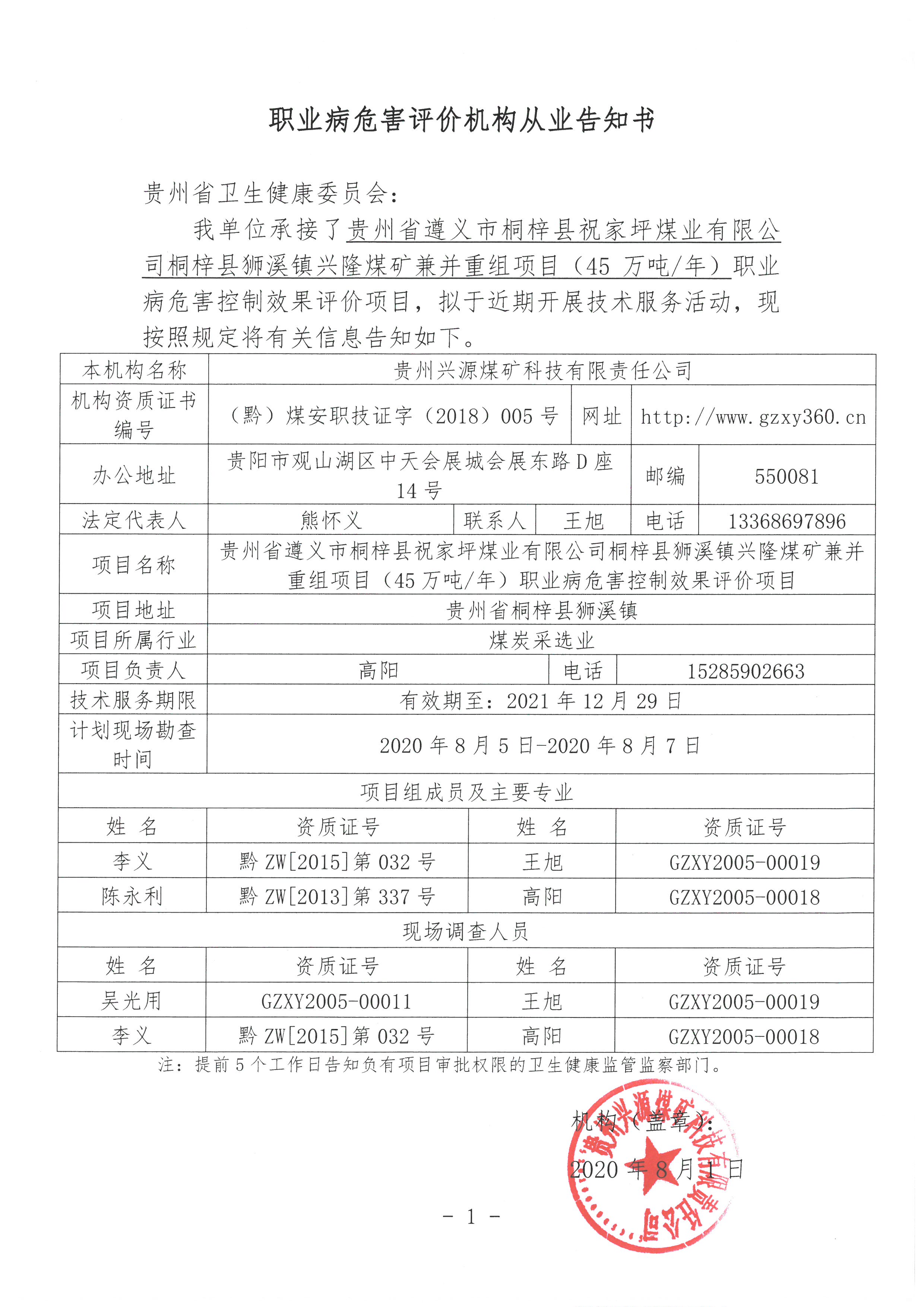 職業(yè)病危害評(píng)價(jià)機(jī)構(gòu)從業(yè)告知書(shū)【貴州省遵義市桐梓縣祝家坪煤業(yè)有限公司桐梓縣獅溪鎮(zhèn)興隆煤礦】