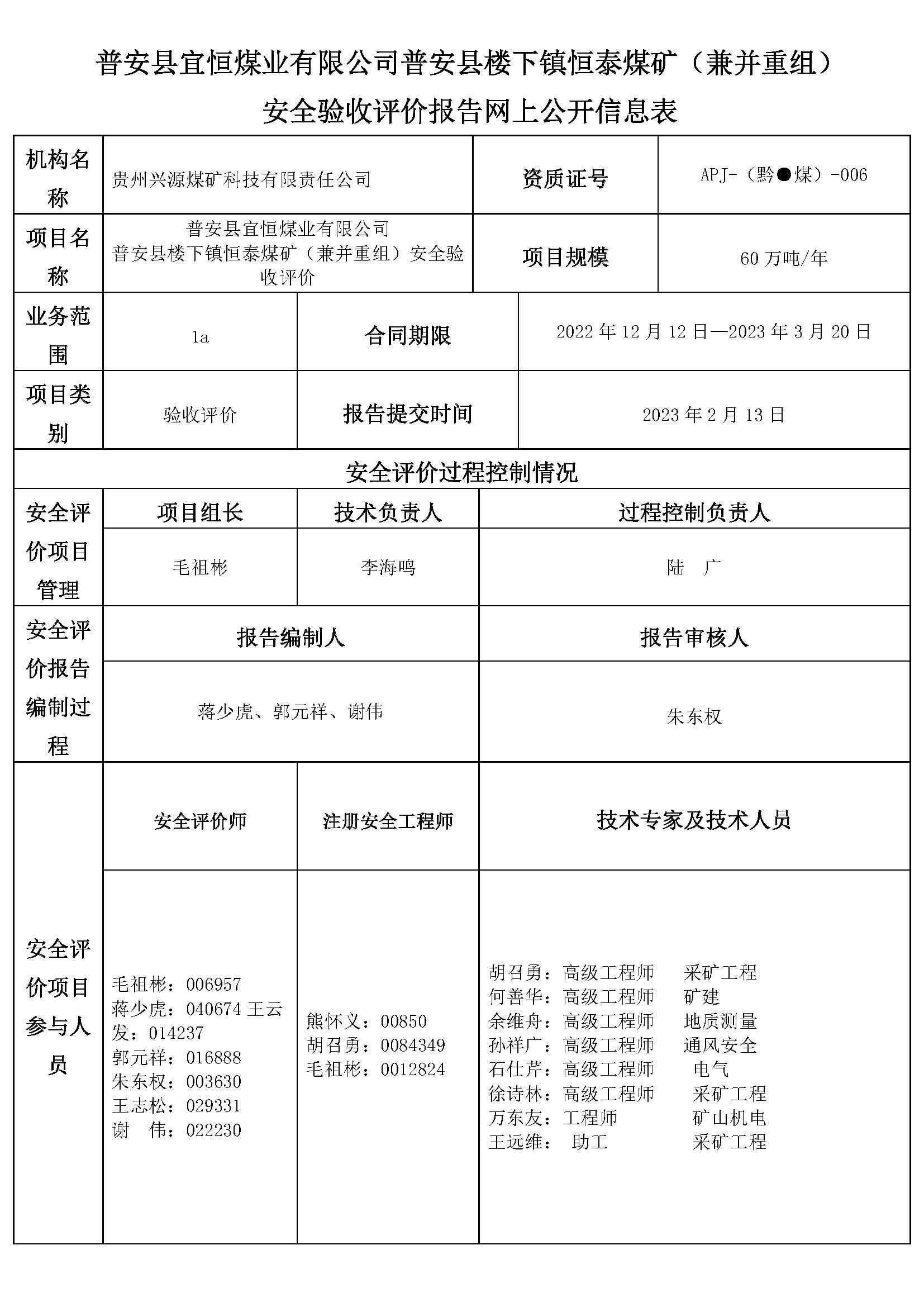 普安縣宜恒煤業(yè)有限公司普安縣樓下鎮(zhèn)恒泰煤礦(兼并重組) 安全驗收評價報告網(wǎng)上公開信息表