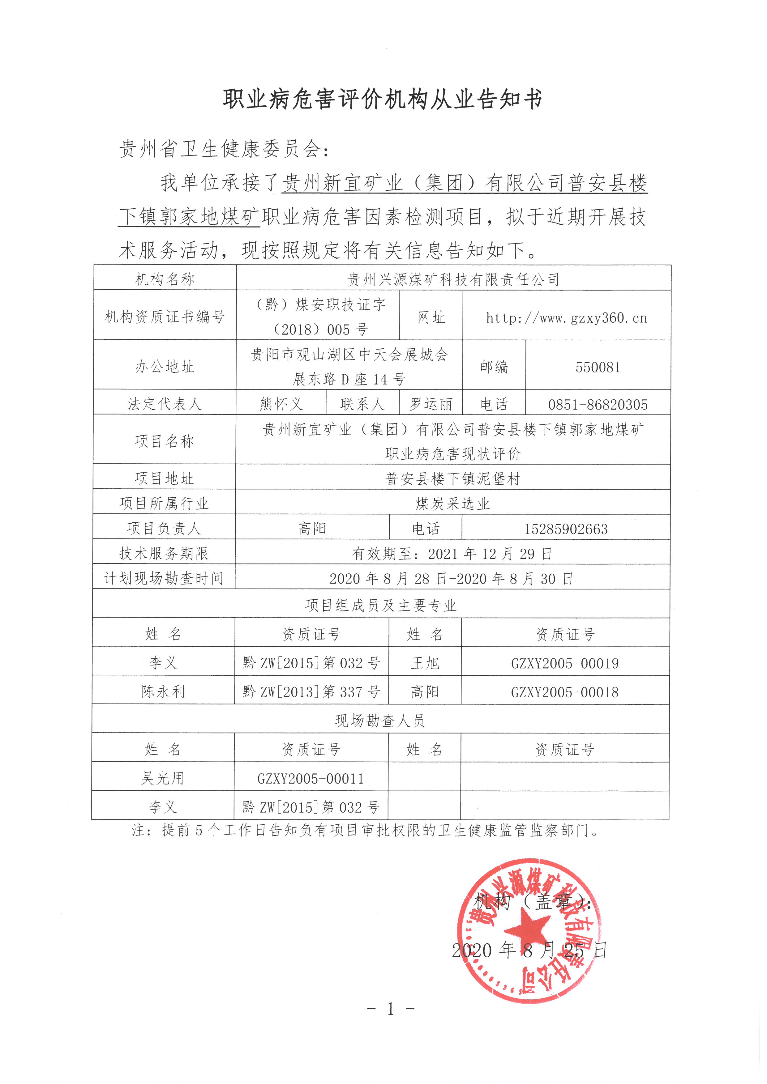 職業(yè)病危害評價機構從業(yè)告知書【貴州新宜礦業(yè)(集團)有限公司普安縣樓下鎮(zhèn)郭家地煤礦】