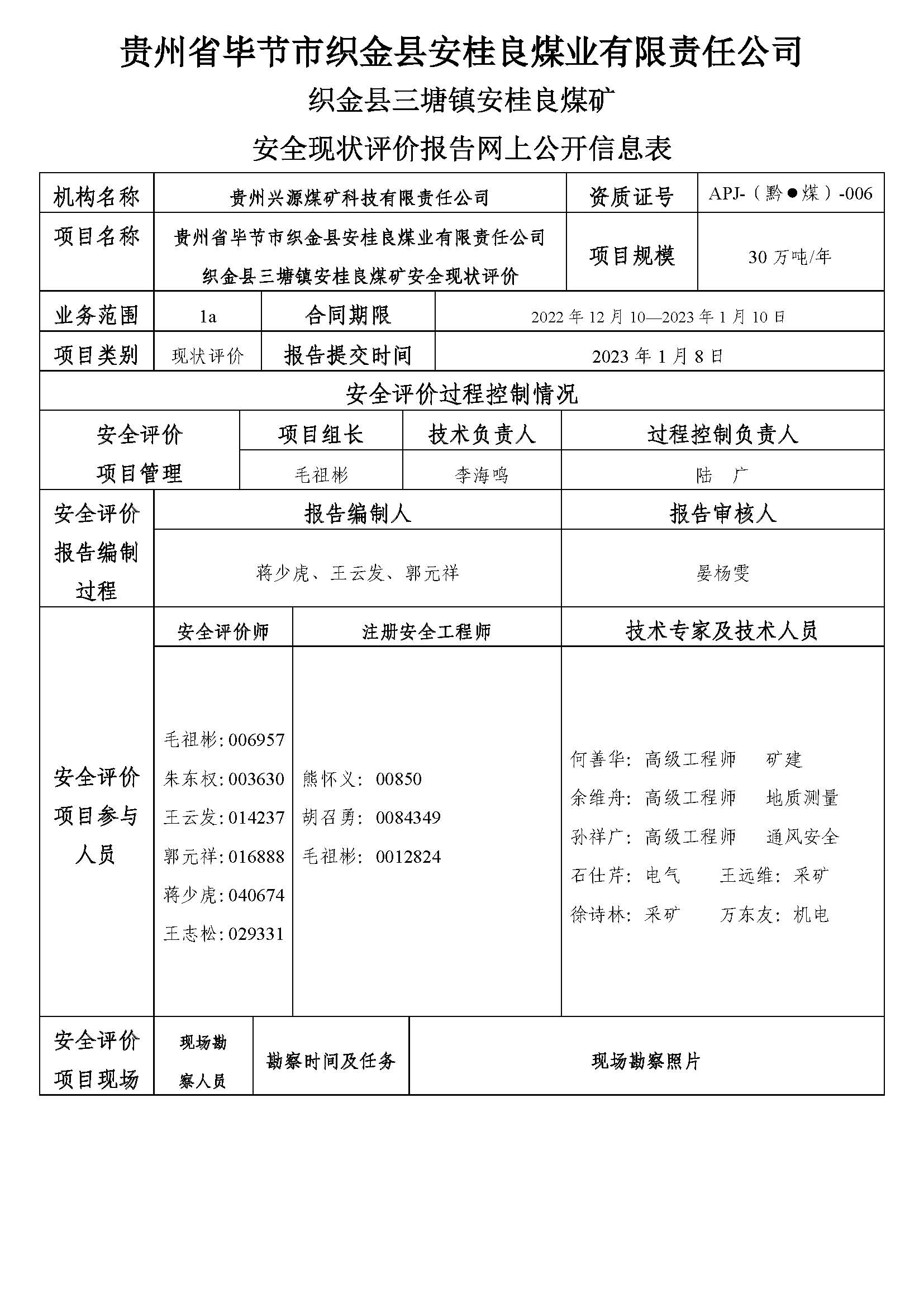 貴州省畢節(jié)市織金縣安桂良煤業(yè)有限責任公司織金縣三塘鎮(zhèn)安桂良煤礦安全現狀評價報告網上公開信息表