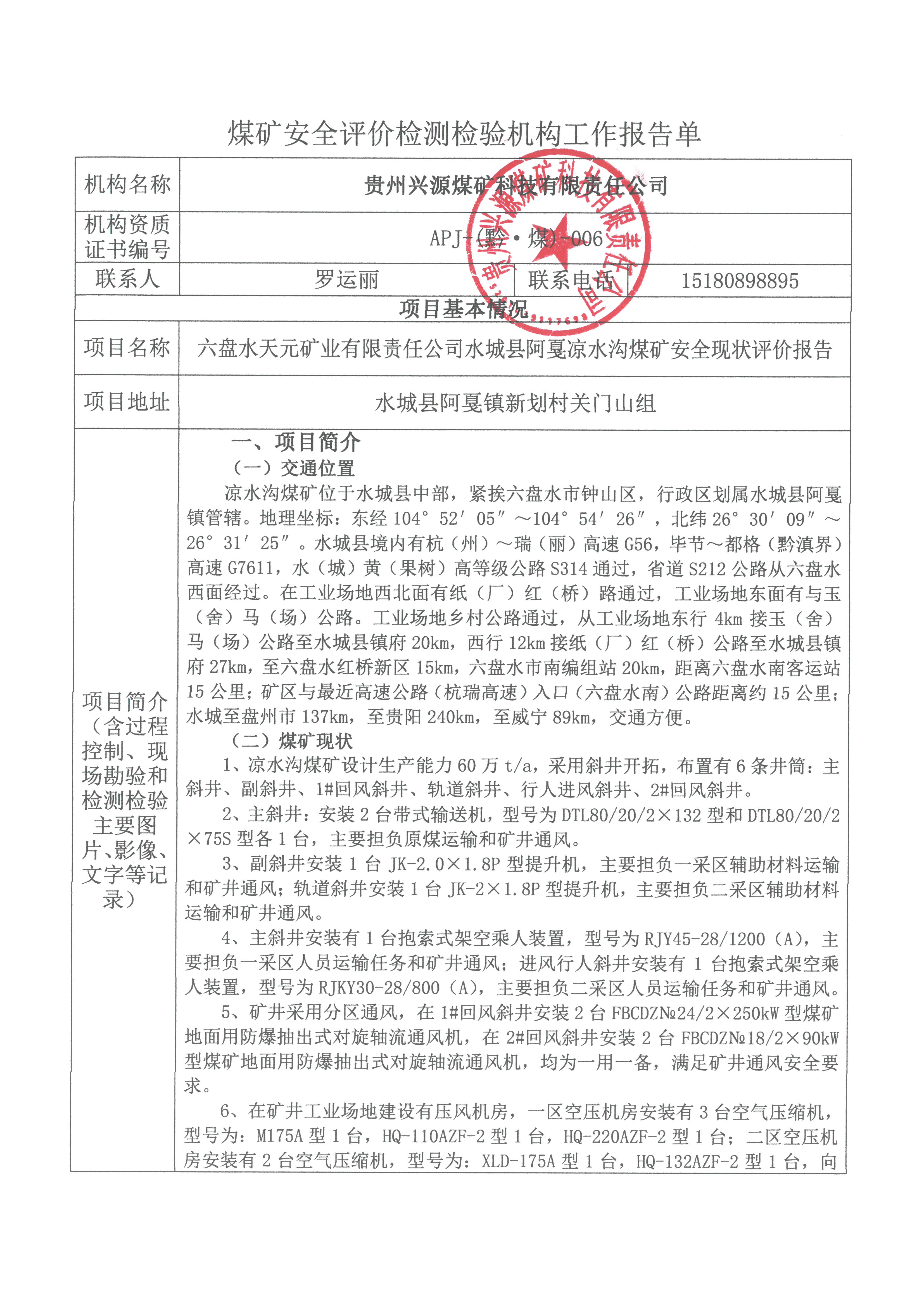 煤礦安全評(píng)價(jià)檢測(cè)檢驗(yàn)機(jī)構(gòu)工作報(bào)告單【六盤水天元礦業(yè)有限責(zé)任公司水城縣阿戛涼水溝煤礦安全現(xiàn)狀評(píng)價(jià)報(bào)告】