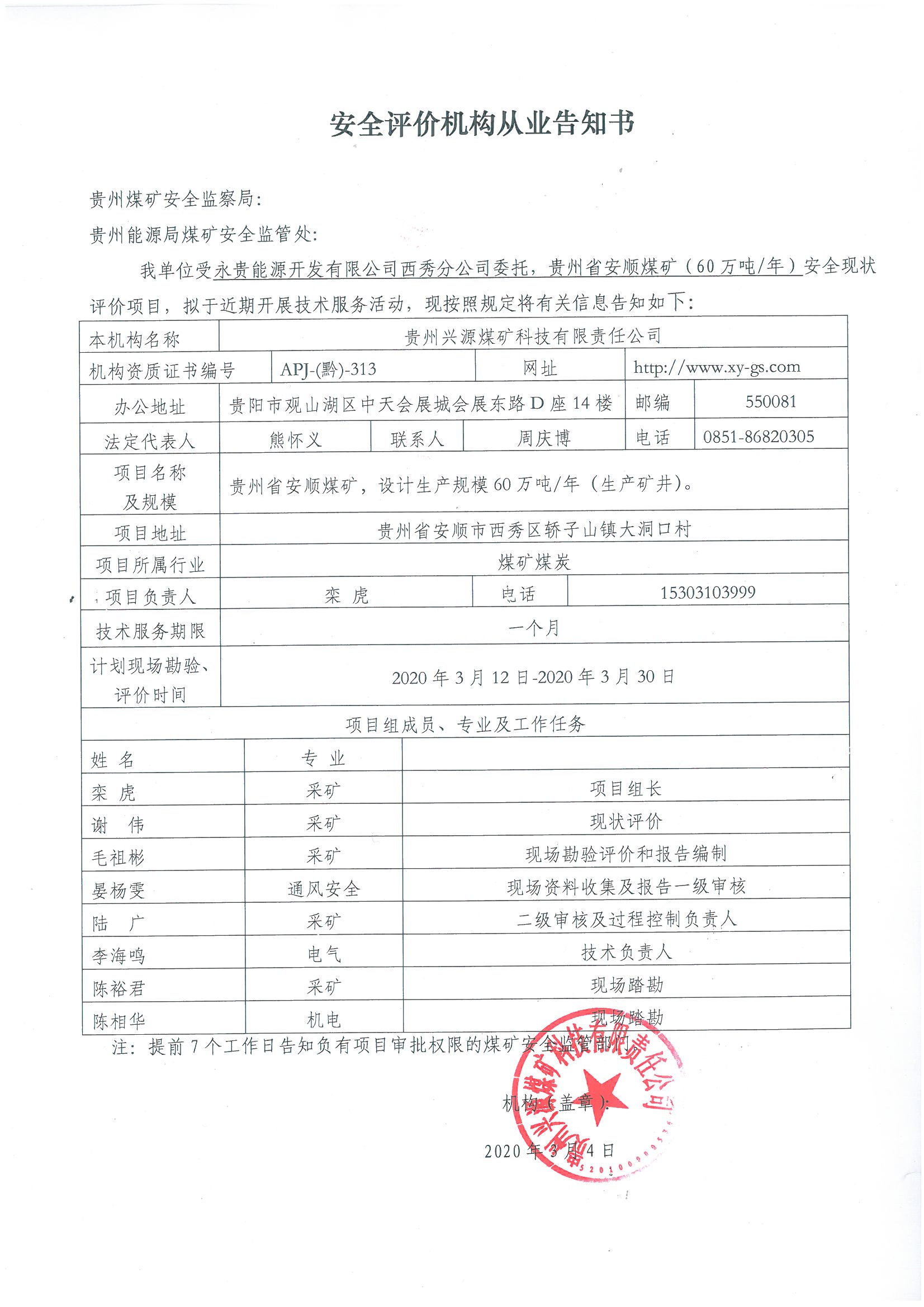 安全評價(jià)機(jī)構(gòu)從業(yè)告知書[永貴能源開發(fā)有限公司西秀分公司貴州省安順煤礦(60萬噸/年)安全現(xiàn)狀評價(jià)]