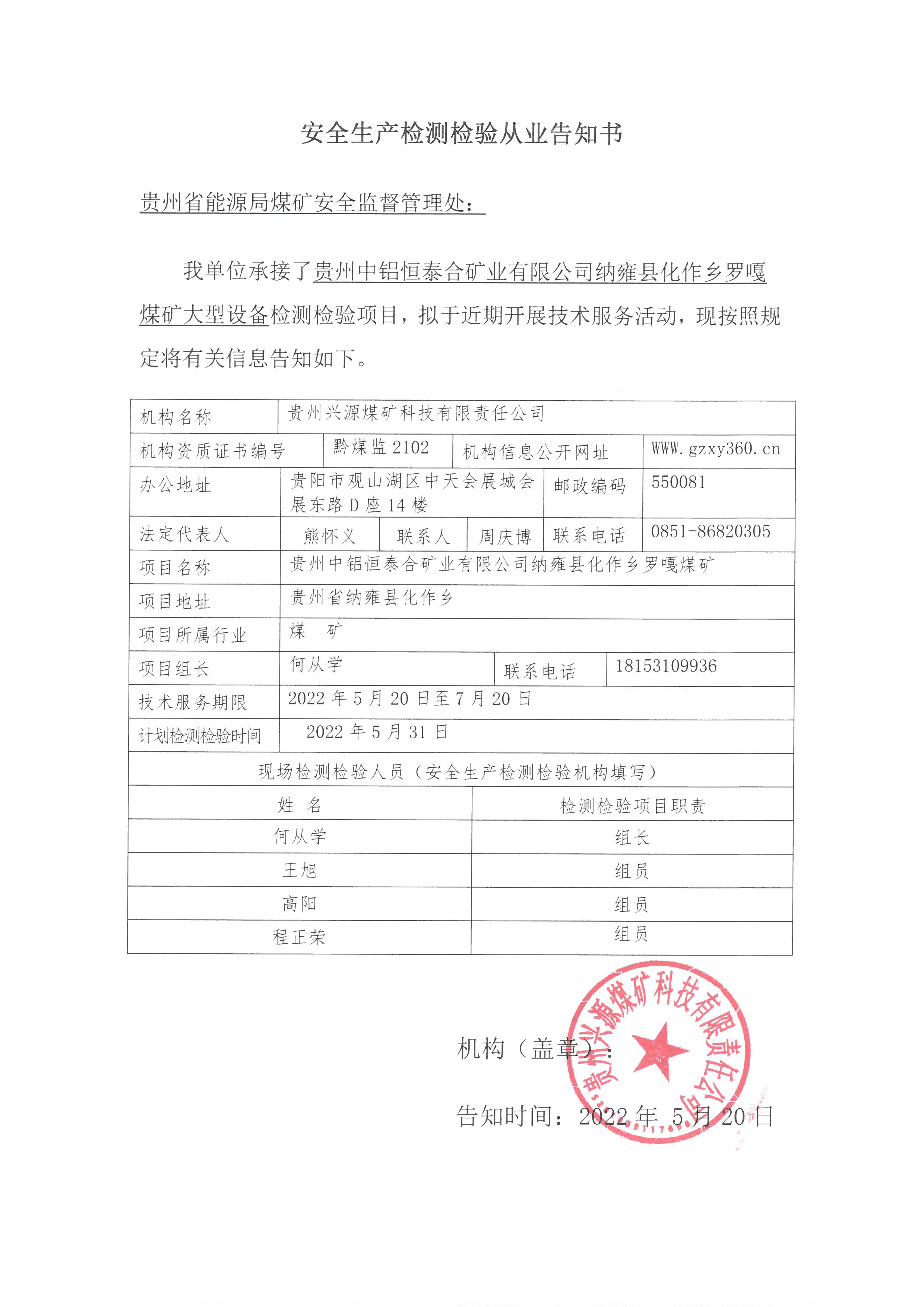 安全生產(chǎn)檢測(cè)檢驗(yàn)從業(yè)告知書【貴州中鋁恒泰合礦業(yè)有限公司納雍縣化作鄉(xiāng)羅嘎煤礦】