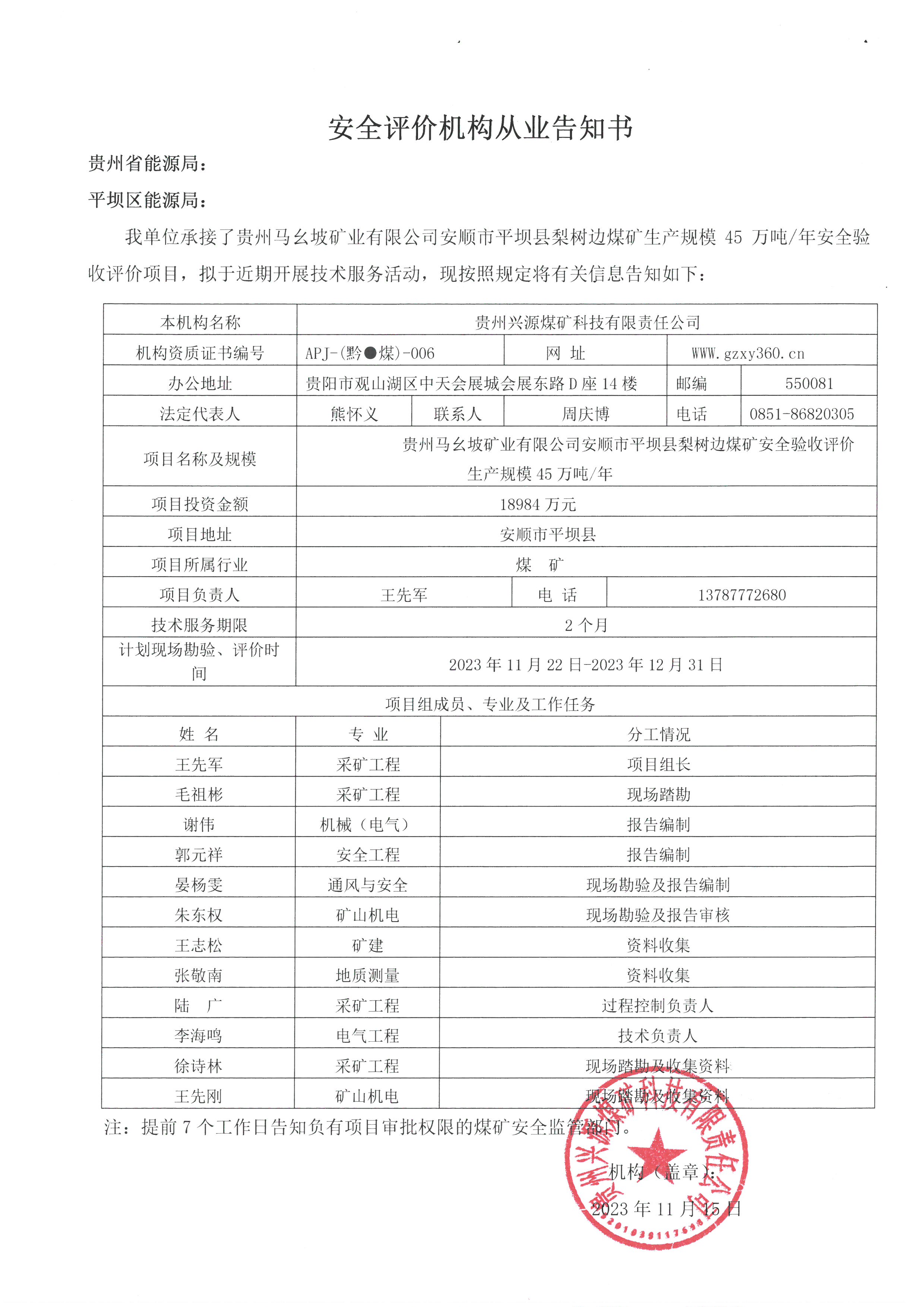 安全驗收評價機構(gòu)從業(yè)告知書【貴州馬幺坡礦業(yè)有限公司安順市平壩縣梨樹邊煤礦】