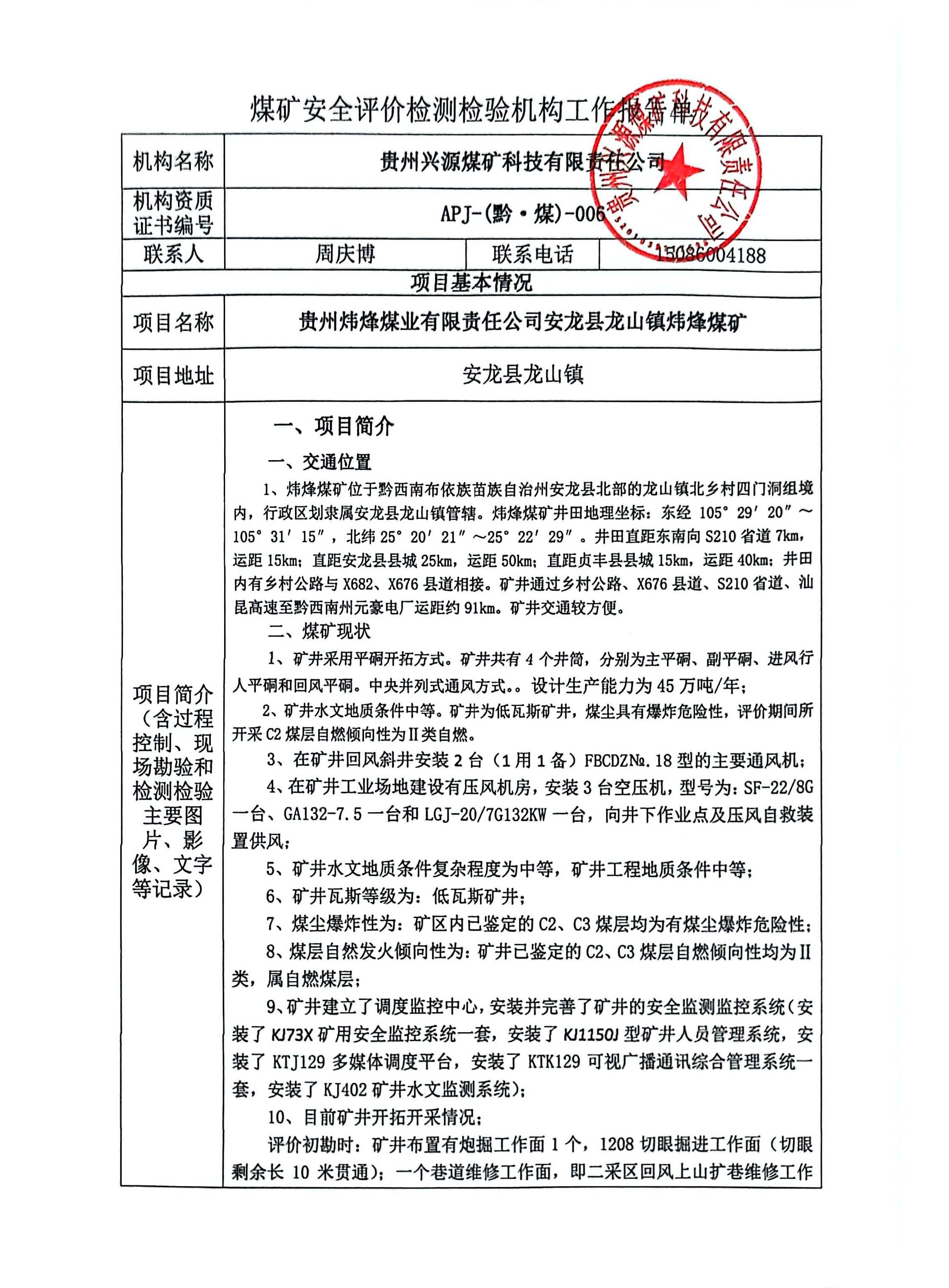煤礦安全評價檢測檢驗機構(gòu)工作報告單【貴州煒烽煤業(yè)有限責任公司安龍縣龍山鎮(zhèn)煒烽煤礦】