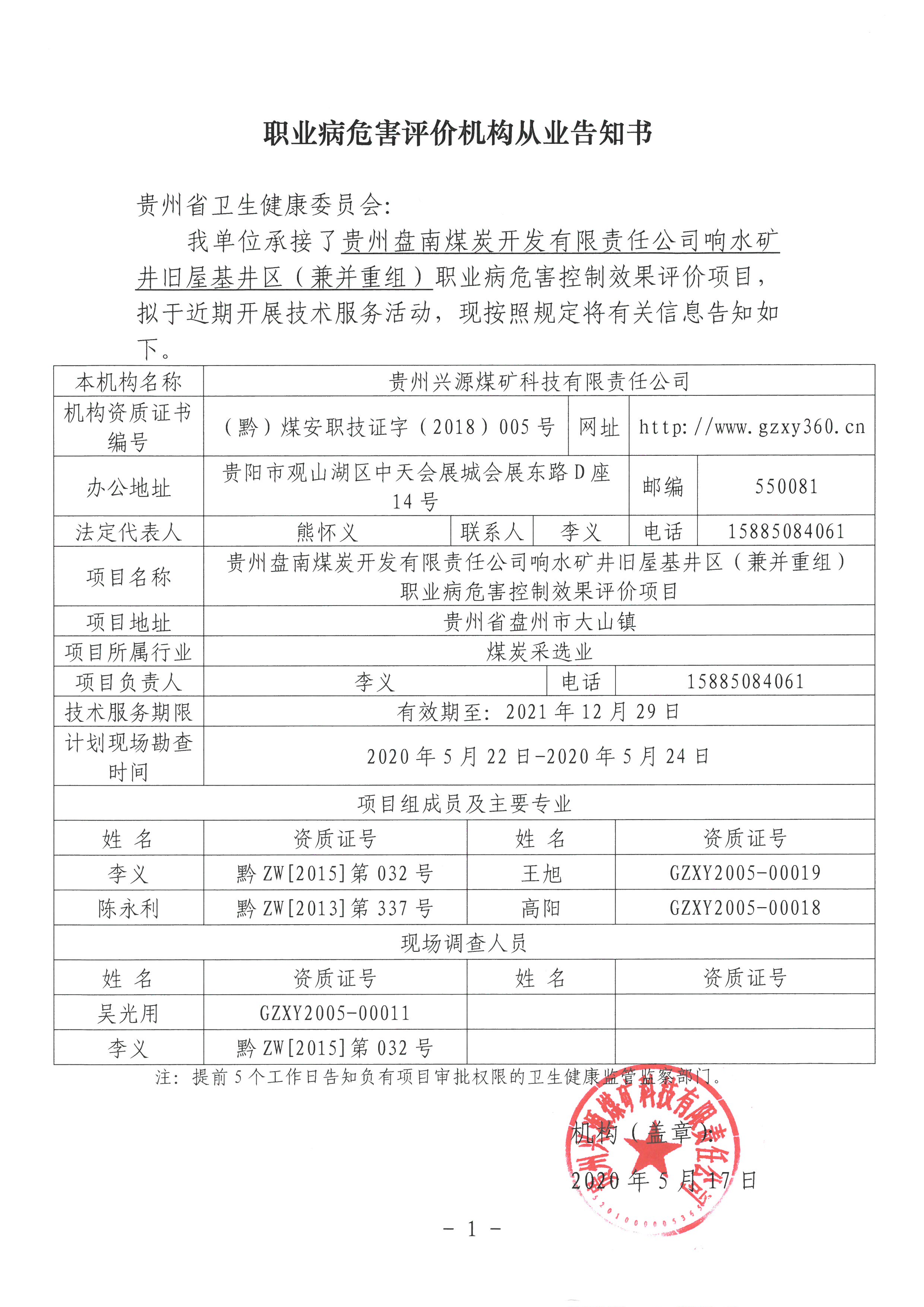 職業(yè)病危害評價機構(gòu)從業(yè)告知書【貴州盤南煤炭開發(fā)有限責任公司響水礦井舊屋基井區(qū)(兼并重組)】