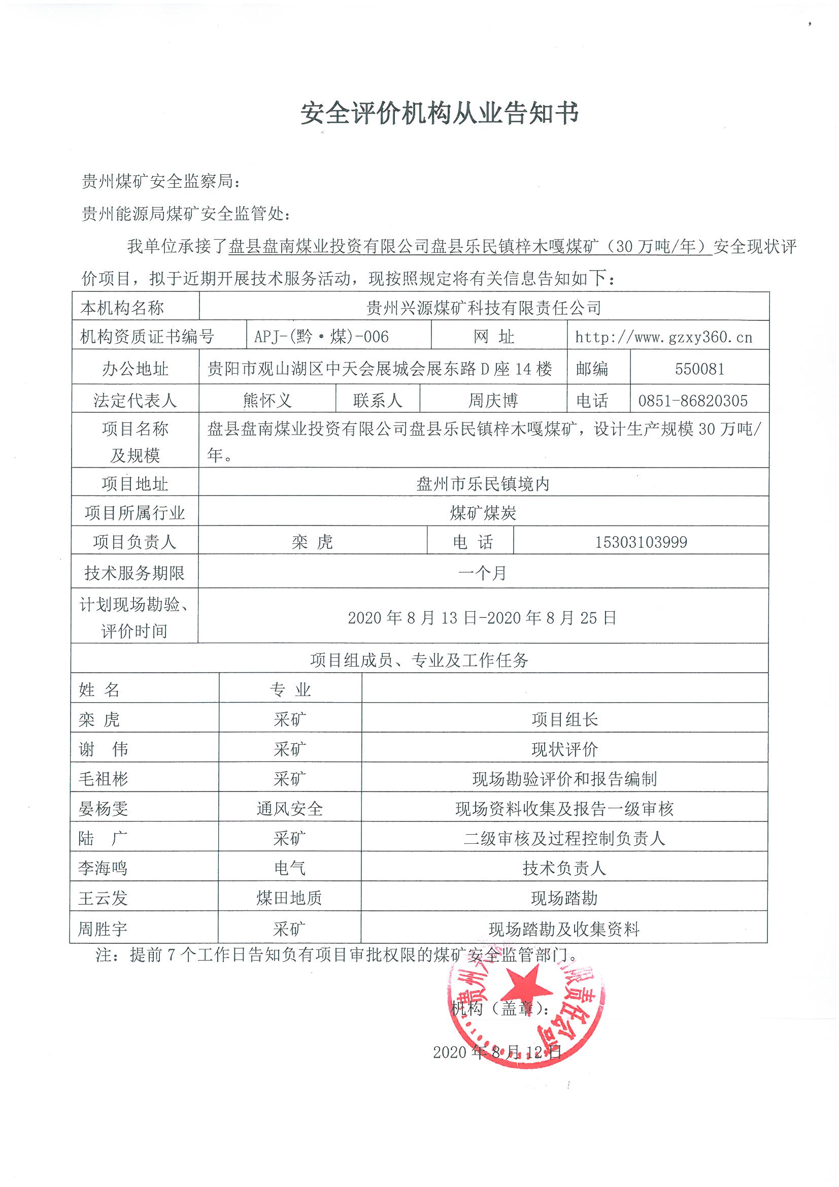 安全評價機構(gòu)從業(yè)告知書(盤縣盤南煤業(yè)投資有限公司盤縣樂民鎮(zhèn)梓木嘎煤礦)