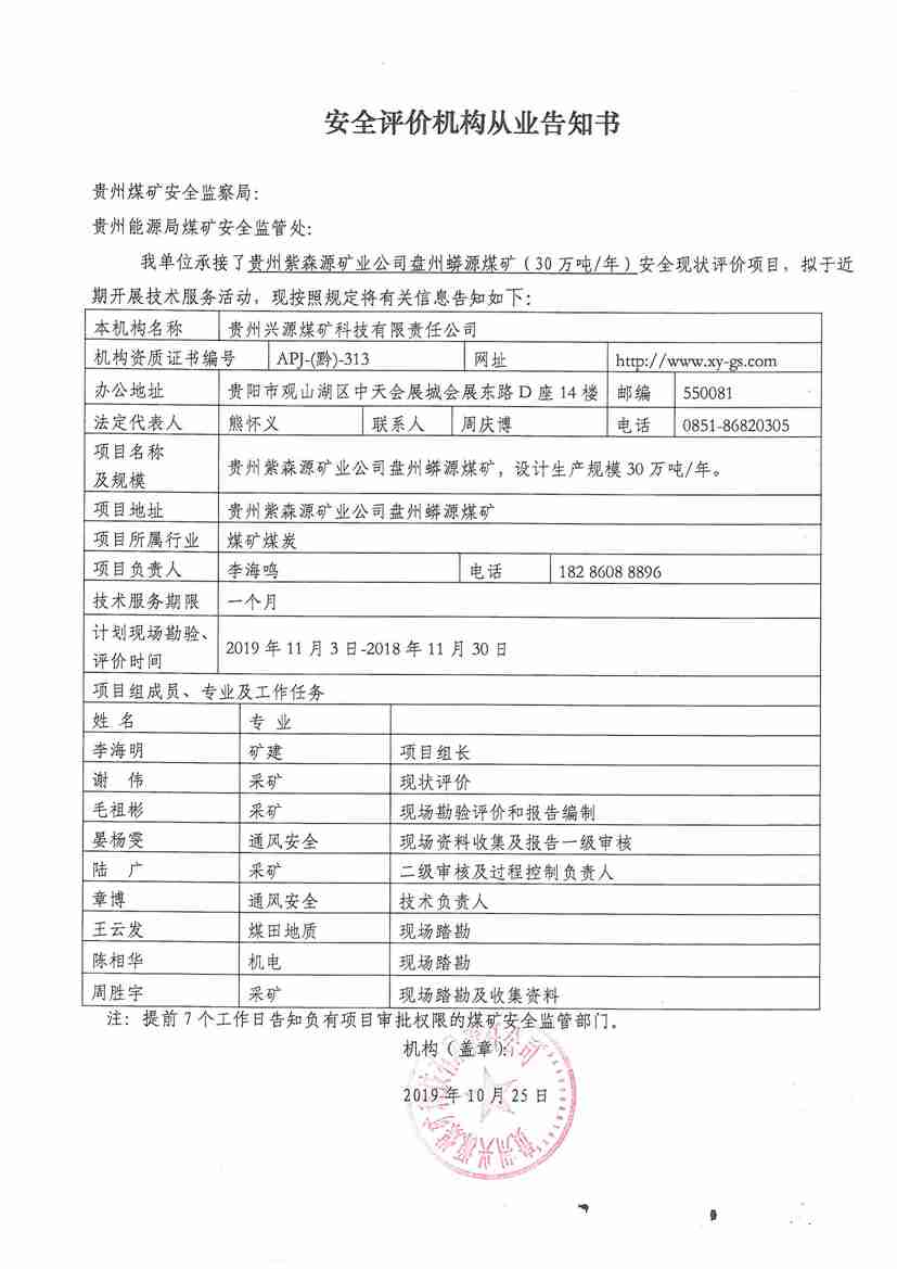 安全評價機構(gòu)從業(yè)告知書[貴州紫森源礦業(yè)公司盤州蟒源煤礦(30萬噸/年)安全現(xiàn)狀評價]