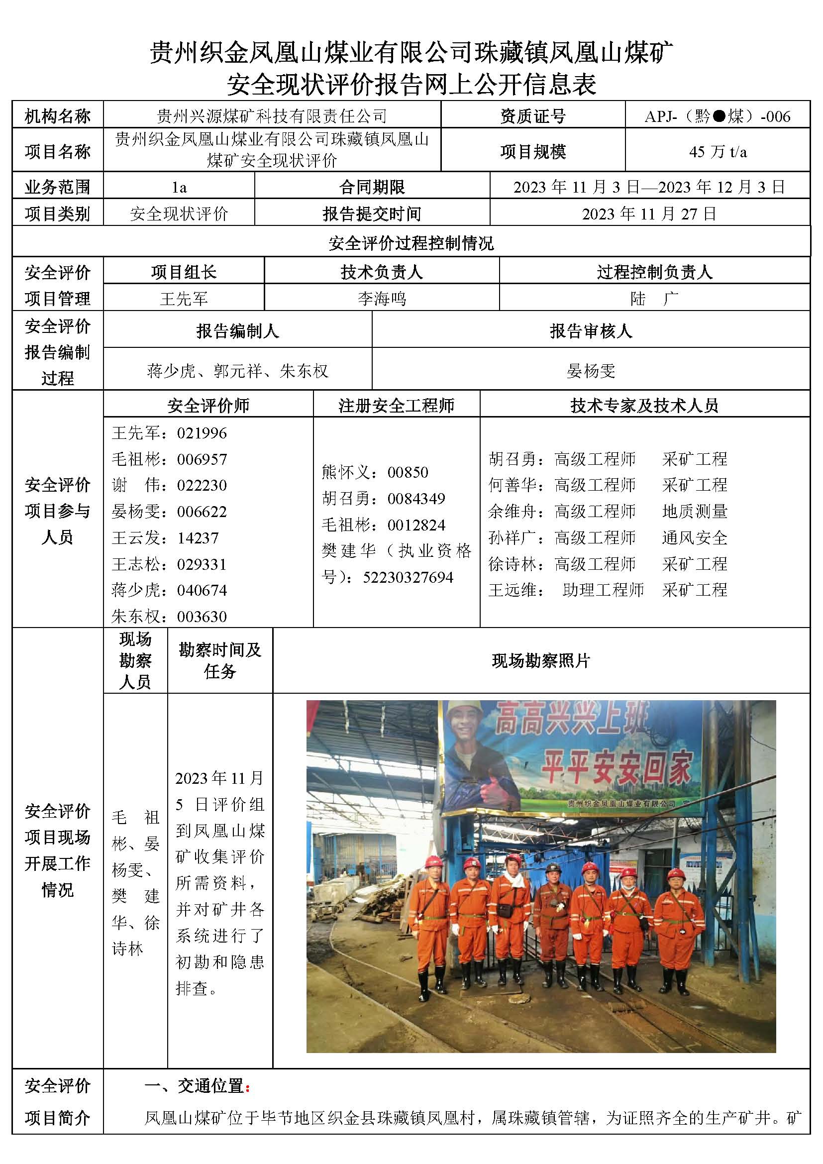 貴州織金鳳凰山煤業(yè)有限公司珠藏鎮(zhèn)鳳凰山煤礦 安全現(xiàn)狀評(píng)價(jià)報(bào)告網(wǎng)上公開信息表