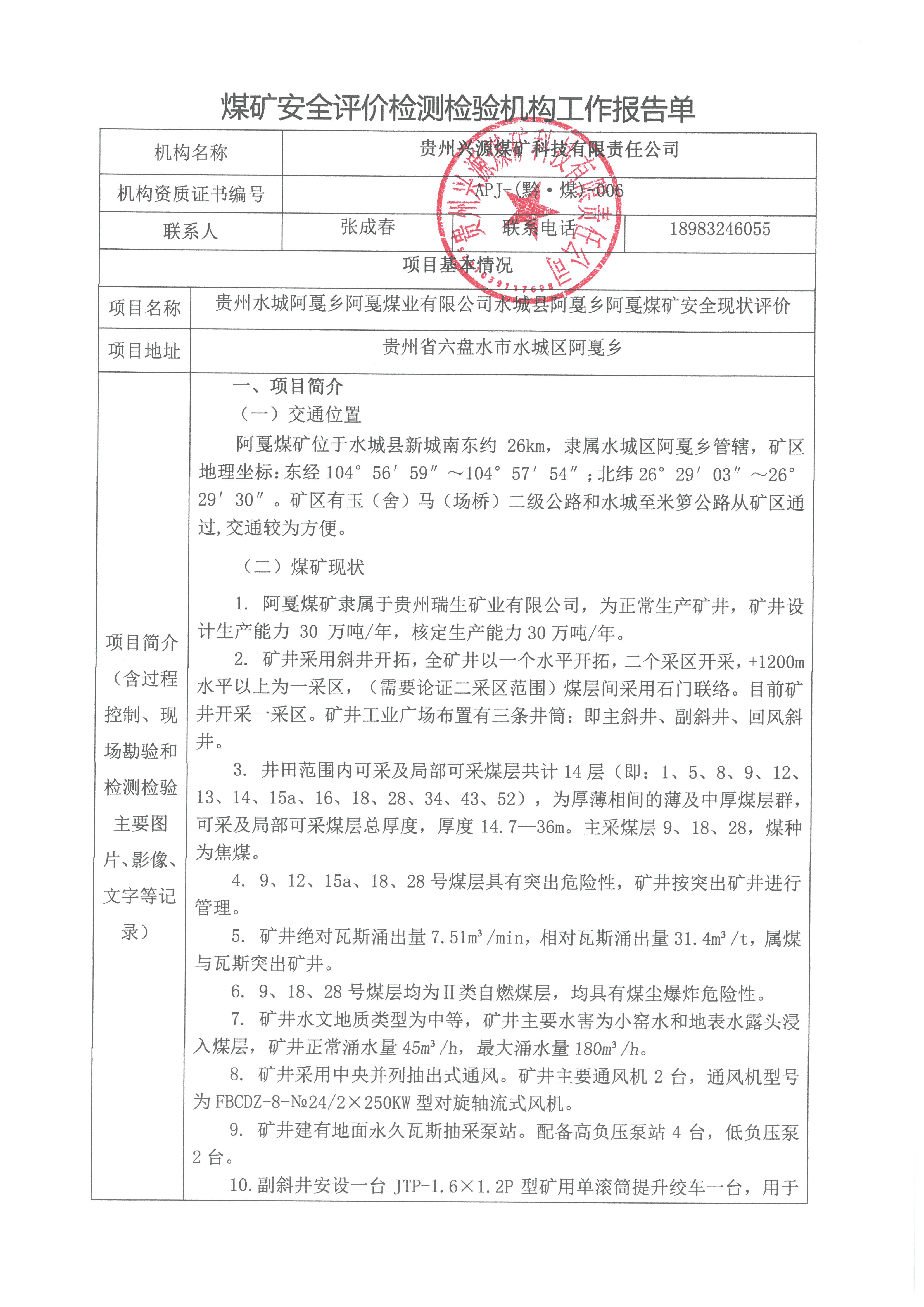 煤礦安全評(píng)價(jià)檢測(cè)檢驗(yàn)機(jī)構(gòu)工作報(bào)告單【貴州水城阿戛鄉(xiāng)阿戛煤業(yè)有限公司水城縣阿戛鄉(xiāng)阿戛煤礦安全現(xiàn)狀評(píng)價(jià)】