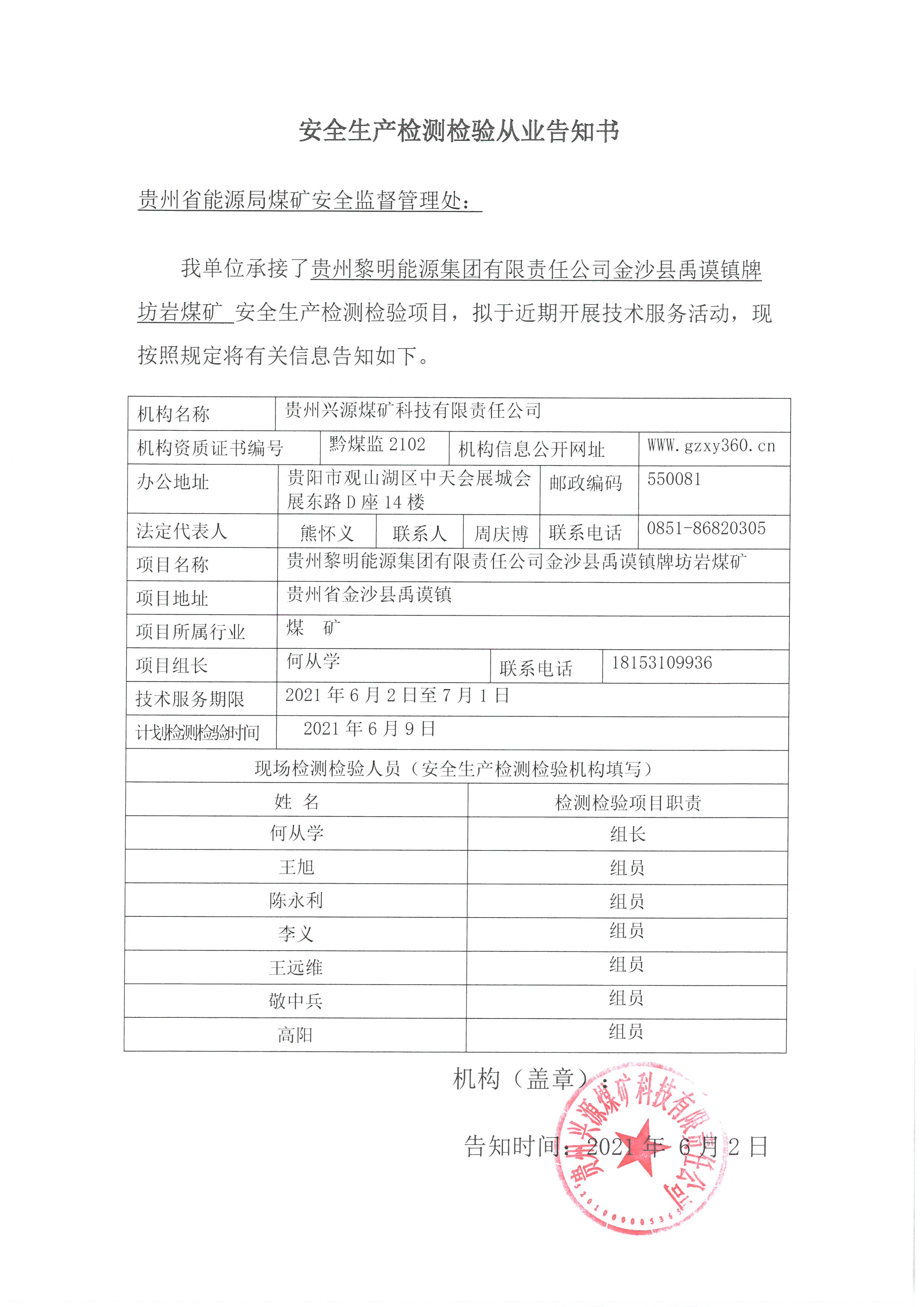 安全生產檢測檢驗從業(yè)告知書【貴州黎明能源集團有限責任公司金沙縣禹謨鎮(zhèn)牌坊巖煤礦】