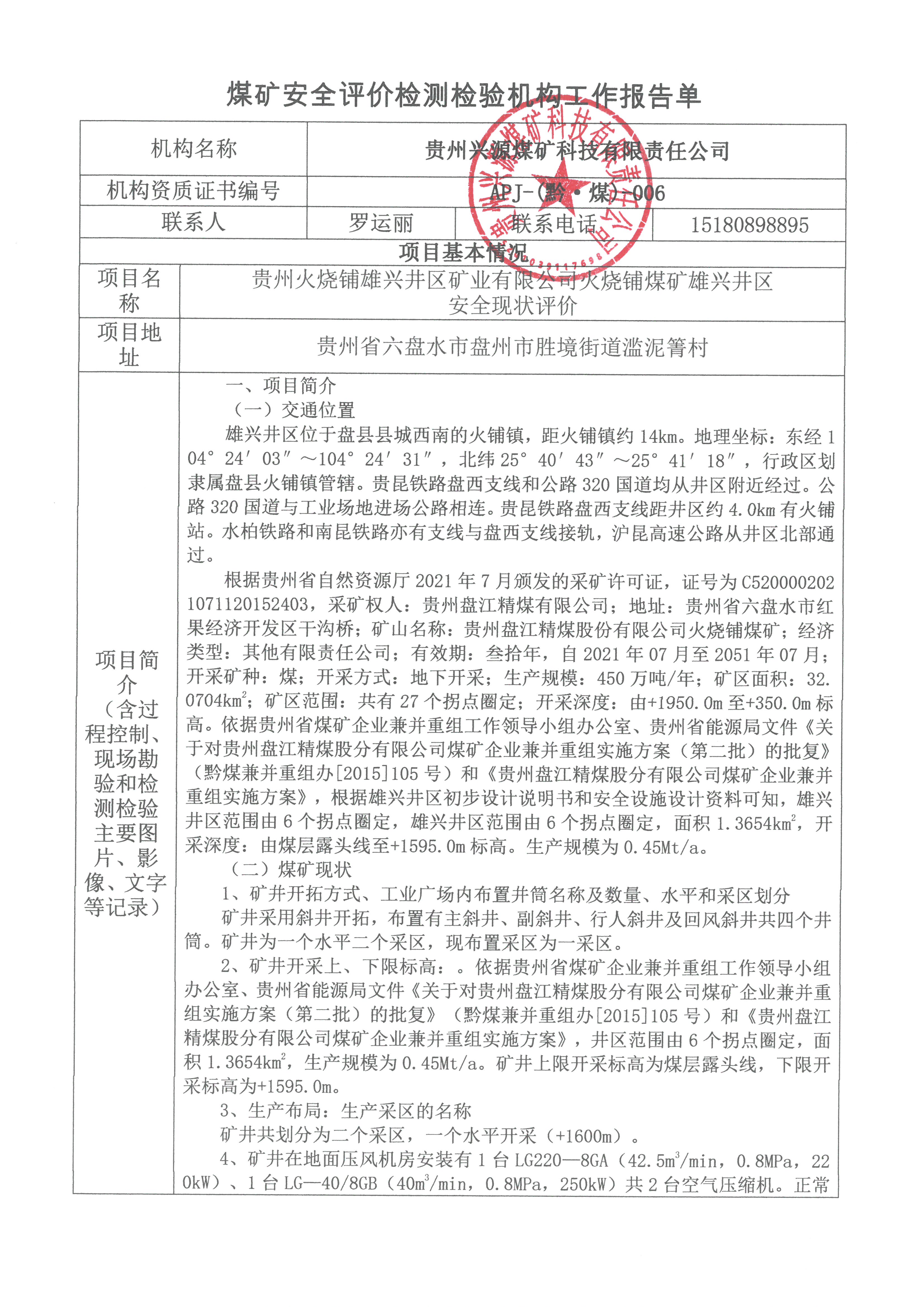 煤礦安全評價檢測檢驗機構工作報告單【貴州火燒鋪雄興井區(qū)礦業(yè)有限公司火燒鋪煤礦雄興井區(qū)安全現狀評價】