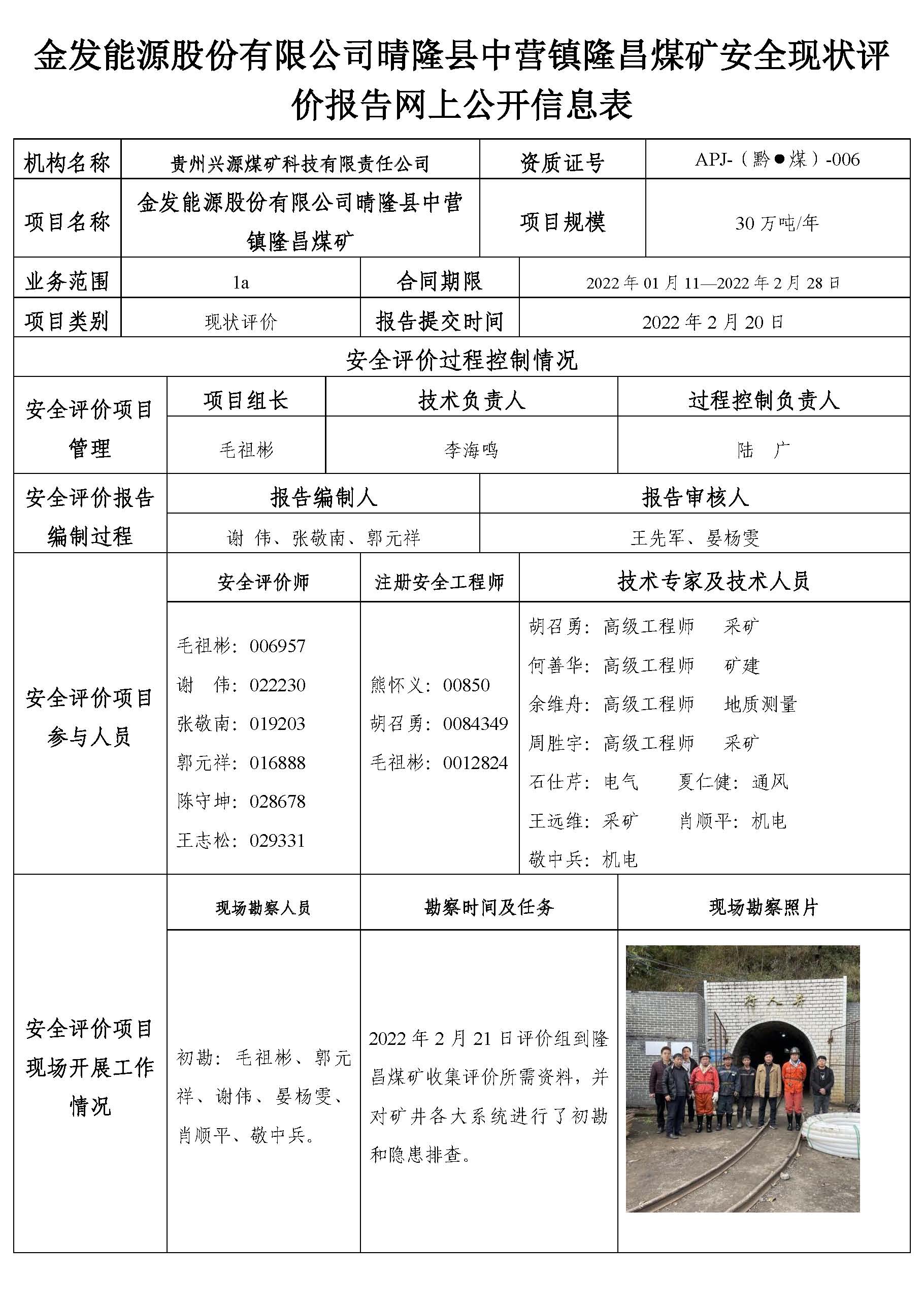 金發(fā)能源股份有限公司晴隆縣中營鎮(zhèn)隆昌煤礦安全現(xiàn)狀評價報告網(wǎng)上公開信息表