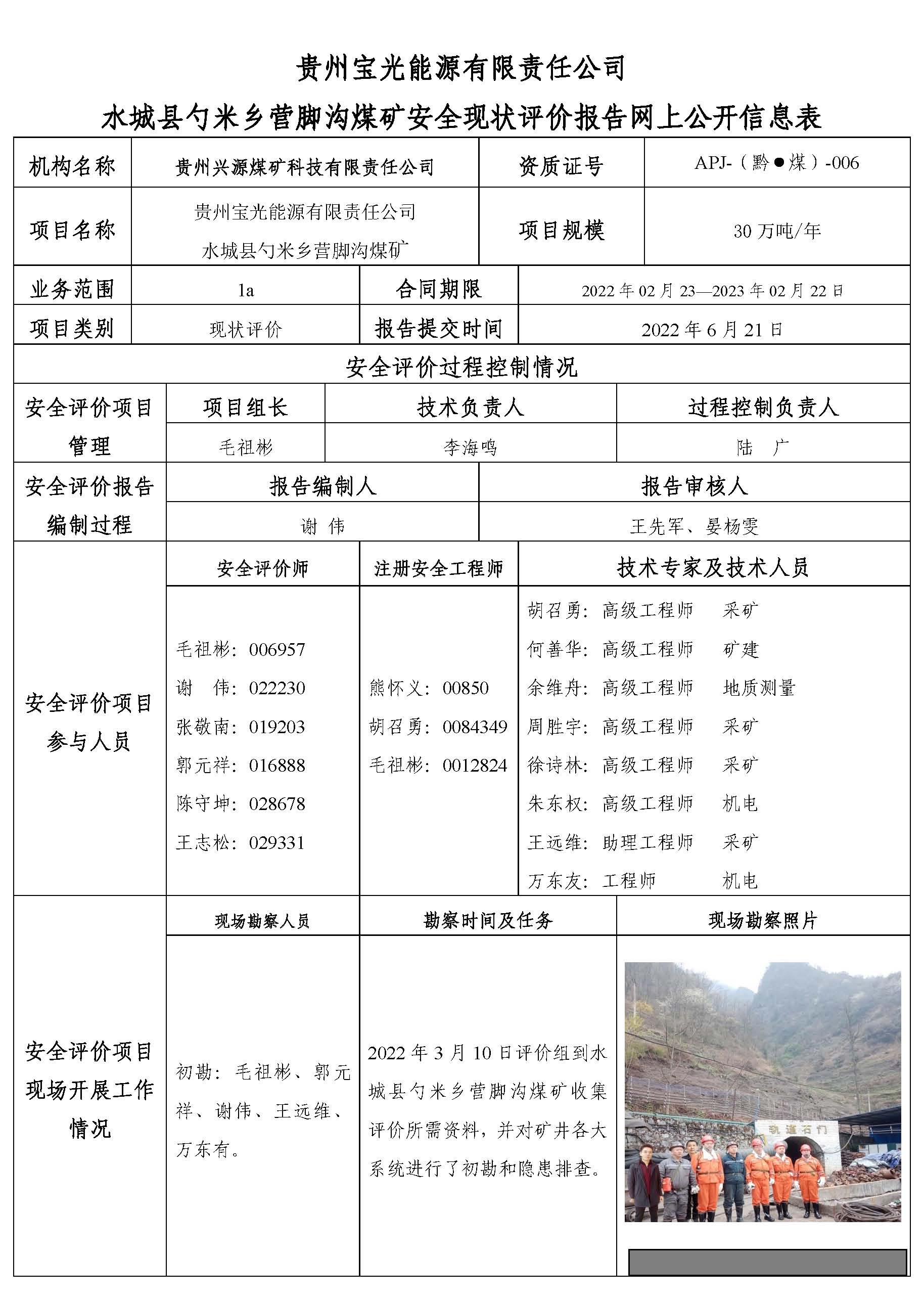 貴州寶光能源有限責(zé)任公司 水城縣勺米鄉(xiāng)營腳溝煤礦安全現(xiàn)狀評(píng)價(jià)報(bào)告網(wǎng)上公開信息表