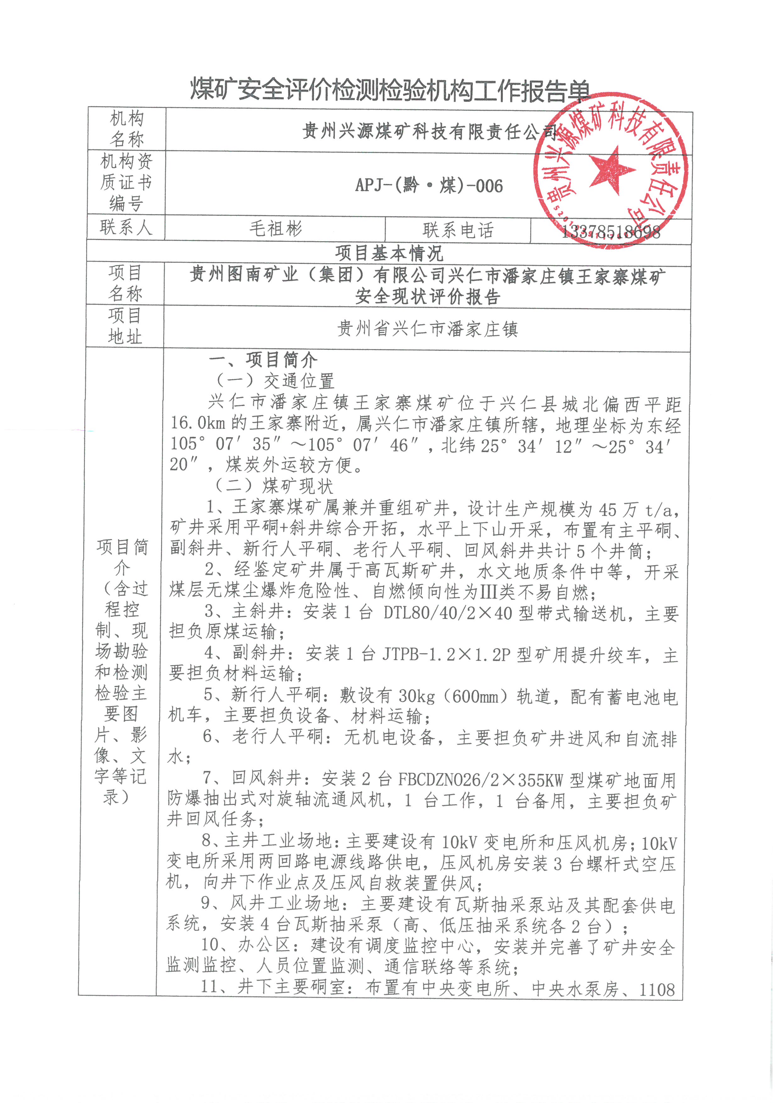 煤礦安全評(píng)價(jià)檢測(cè)檢驗(yàn)機(jī)構(gòu)工作報(bào)告單【貴州圖南礦業(yè)(集團(tuán))有限公司興仁市潘家莊鎮(zhèn)王家寨煤礦 安全現(xiàn)狀評(píng)價(jià)報(bào)告】