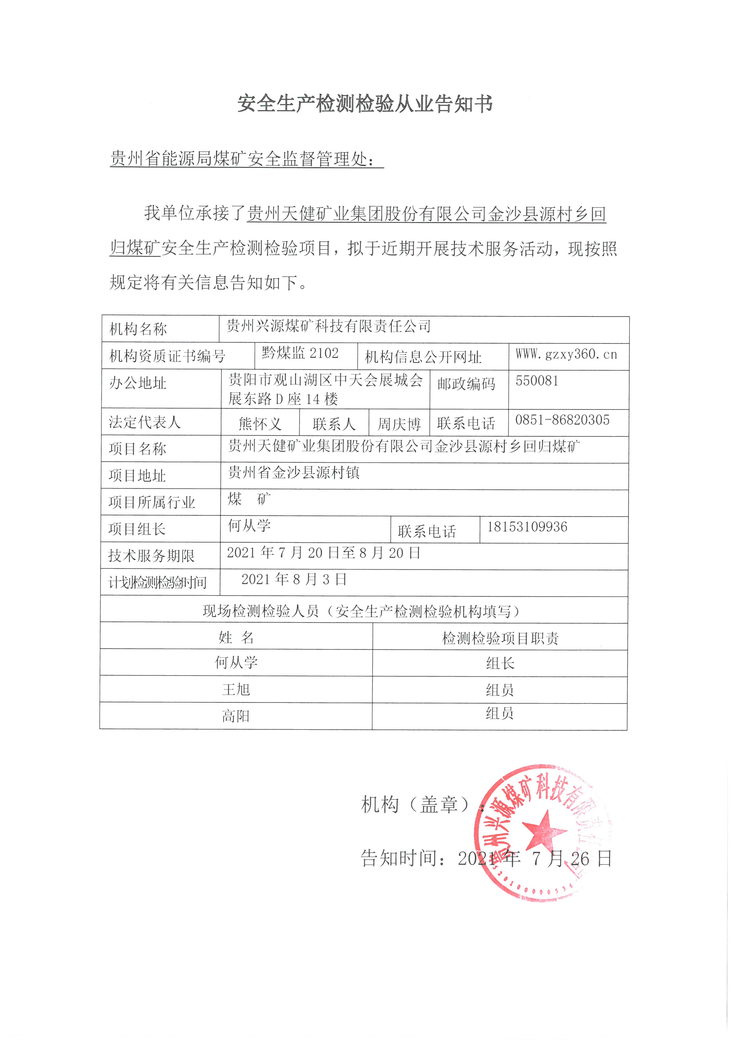 安全生產(chǎn)檢測檢驗從業(yè)告知書【貴州天健礦業(yè)集團股份有限公司金沙縣源村鄉(xiāng)回歸煤礦】