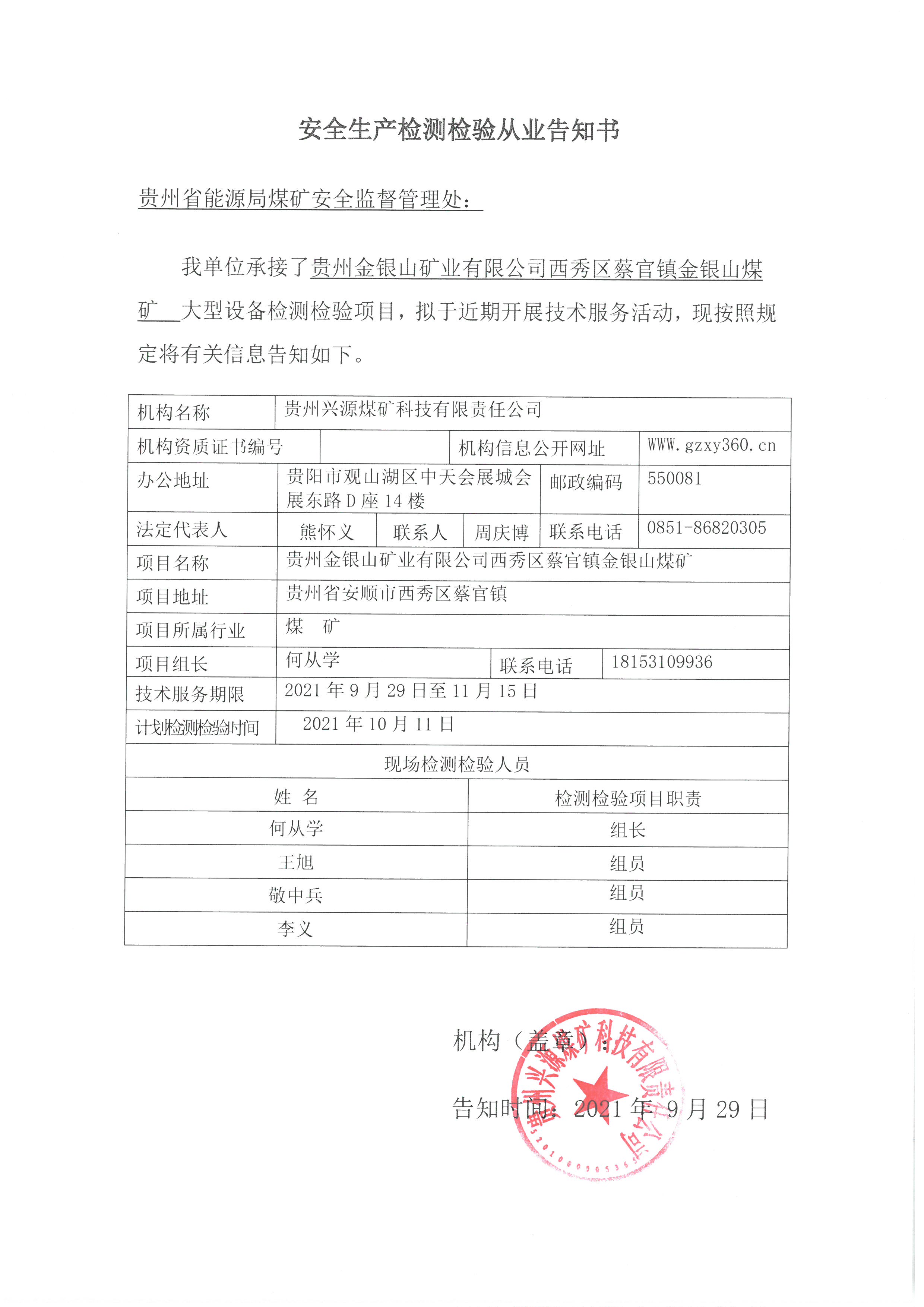 安全生產(chǎn)檢測檢驗從業(yè)告知書【貴州金銀山礦業(yè)有限公司西秀區(qū)蔡官鎮(zhèn)金銀山煤礦】