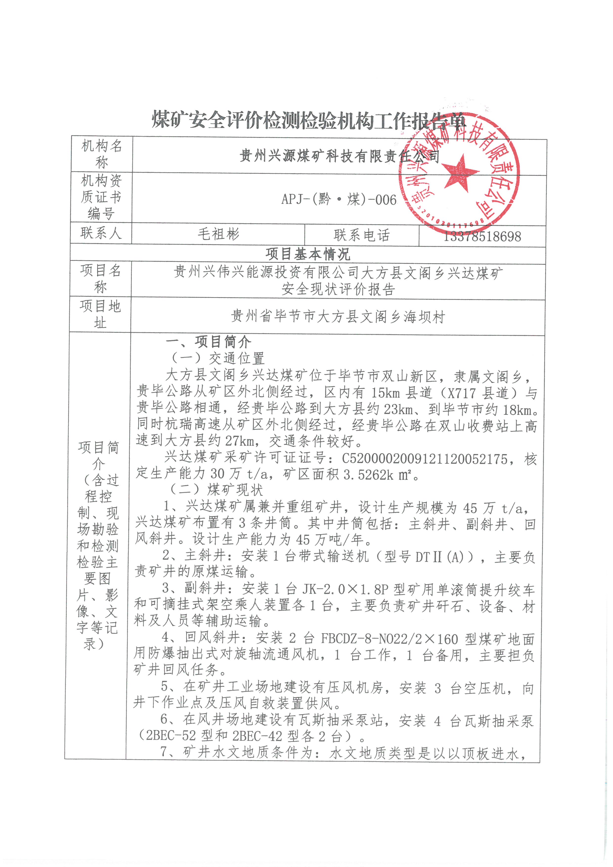煤礦安全評(píng)價(jià)檢測(cè)檢驗(yàn)機(jī)構(gòu)工作報(bào)告單【貴州興偉興能源投資有限公司大方縣文閣鄉(xiāng)興達(dá)煤礦安全現(xiàn)狀評(píng)價(jià)報(bào)告】