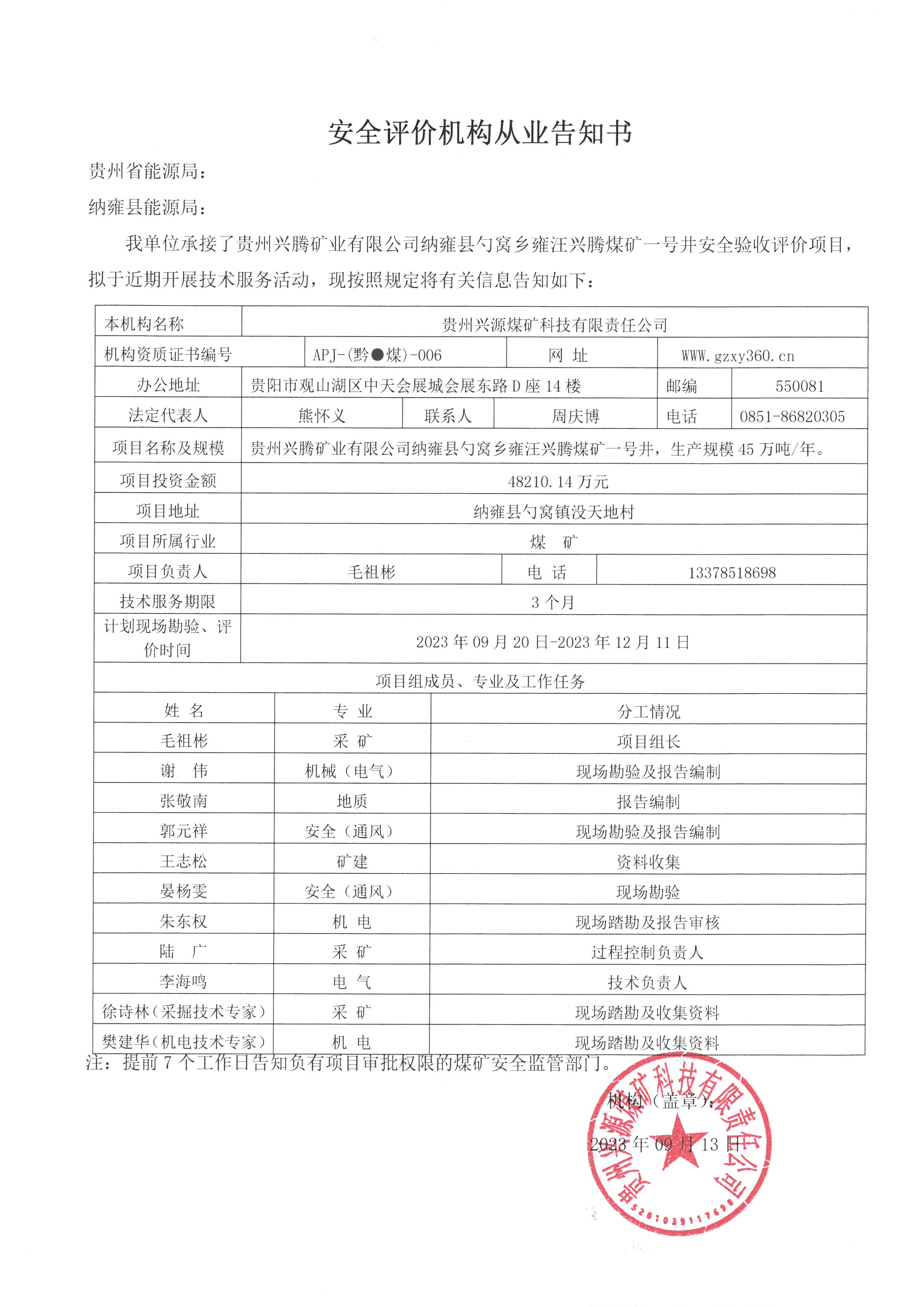 安全評價(jià)機(jī)構(gòu)從業(yè)告知書【貴州興騰礦業(yè)有限公司納雍縣勺窩鄉(xiāng)雍汪興騰煤礦一號井安全驗(yàn)收評價(jià)項(xiàng)目】
