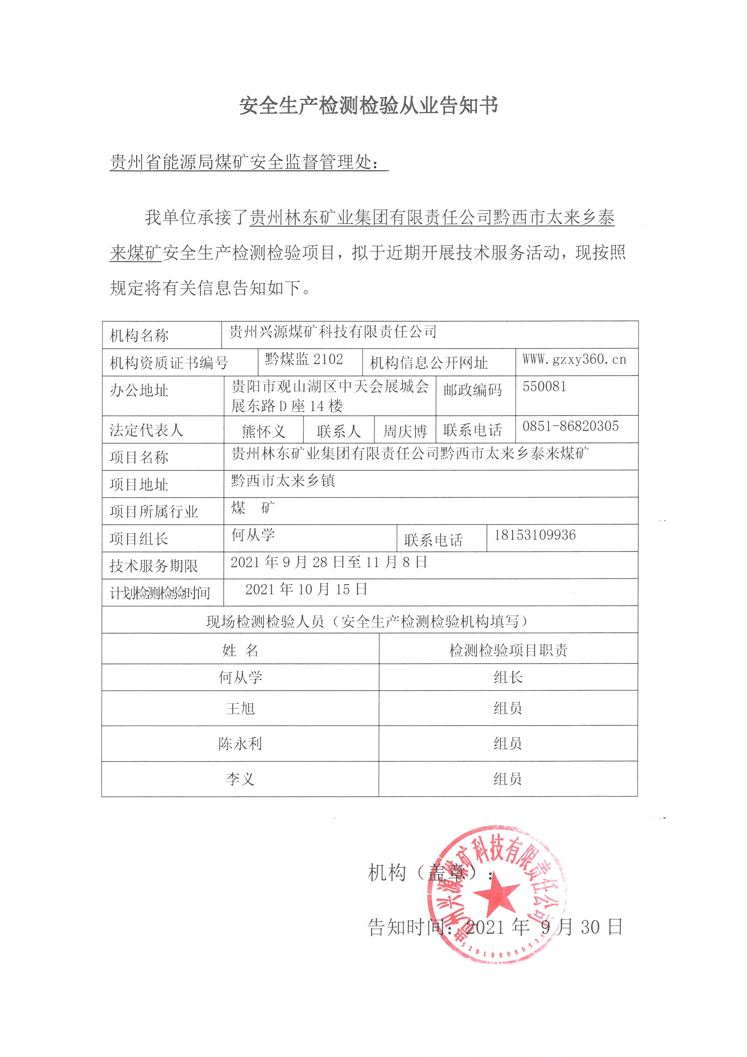 安全生產(chǎn)檢測檢驗(yàn)從業(yè)告知書【貴州林東礦業(yè)集團(tuán)有限責(zé)任公司黔西市太來鄉(xiāng)泰來煤礦】