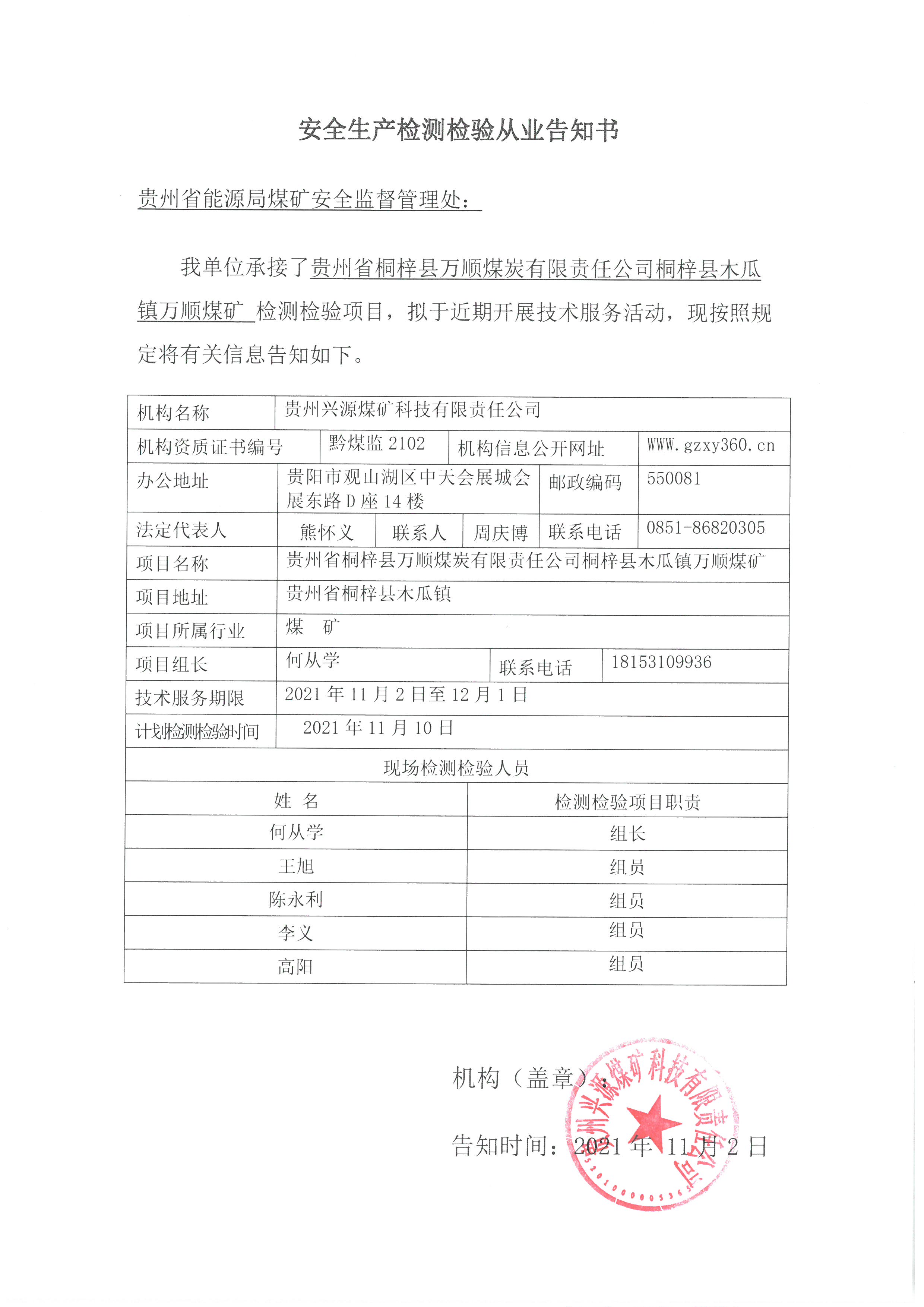 安全生產(chǎn)檢測檢驗(yàn)從業(yè)告知書【貴州省桐梓縣萬順煤炭有限責(zé)任公司桐梓縣木瓜鎮(zhèn)萬順煤礦】
