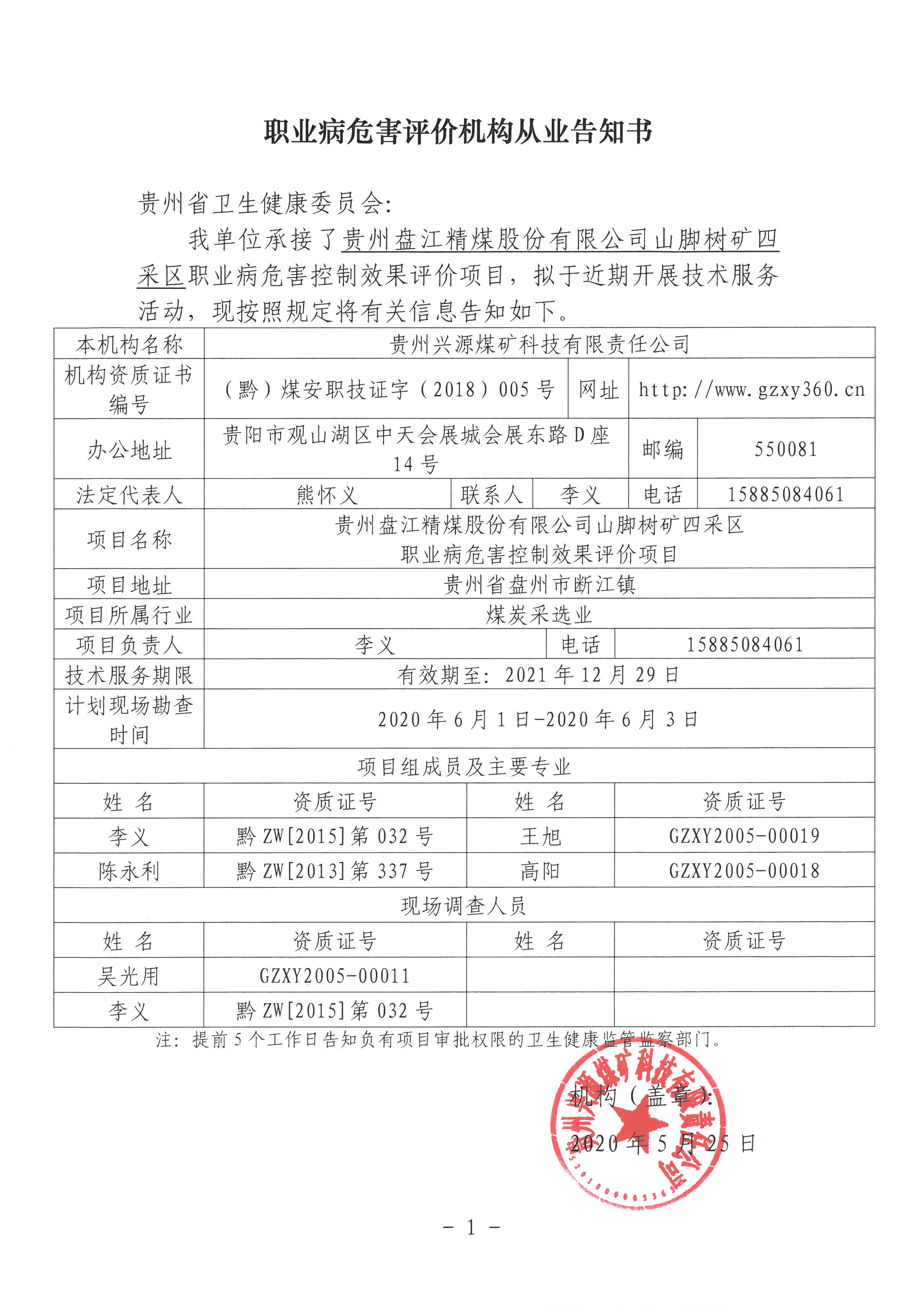 職業(yè)病危害評價(jià)機(jī)構(gòu)從業(yè)告知書[貴州盤江精煤股份有限公司山腳樹煤礦四采區(qū)]