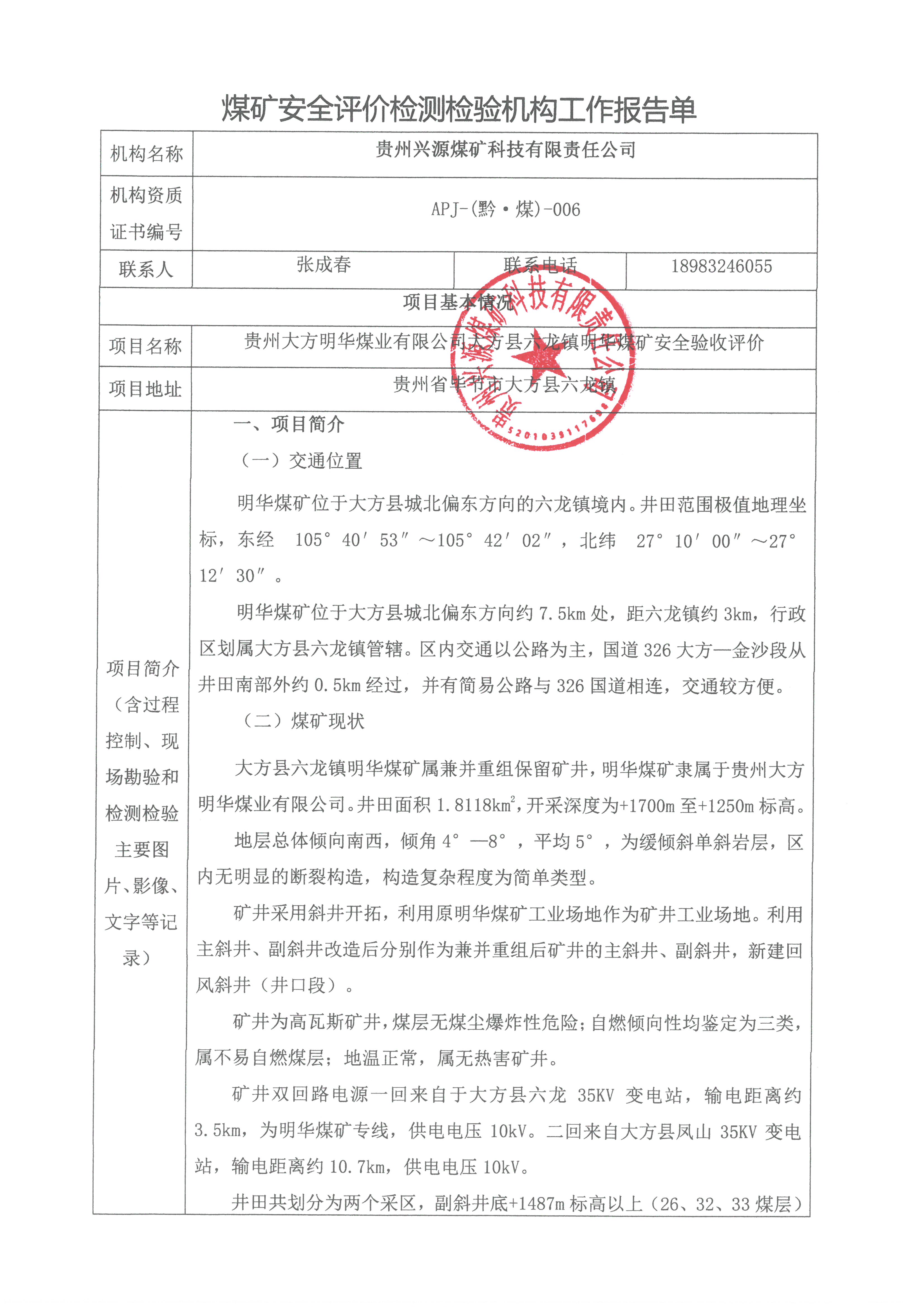 煤礦安全評價檢測檢驗機構(gòu)工作報告單【貴州大方明華煤業(yè)有限公司大方縣六龍鎮(zhèn)明華煤礦安全驗收評價】