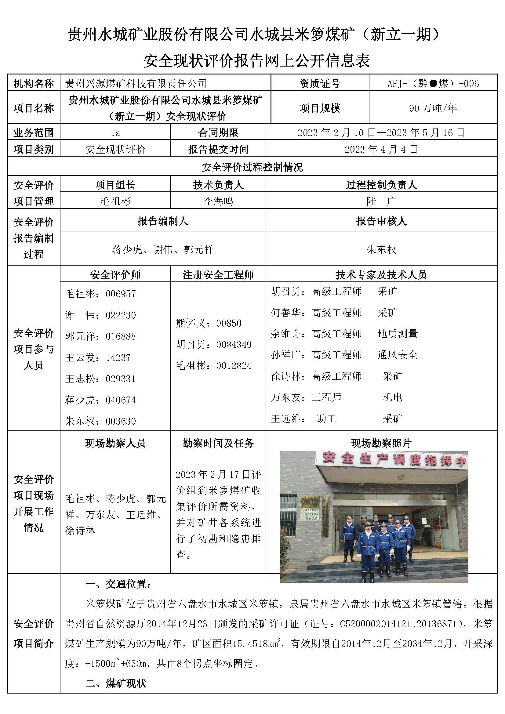 貴州水城礦業(yè)股份有限公司水城縣米籮煤礦(新立一期) 安全現(xiàn)狀評(píng)價(jià)報(bào)告網(wǎng)上公開信息表