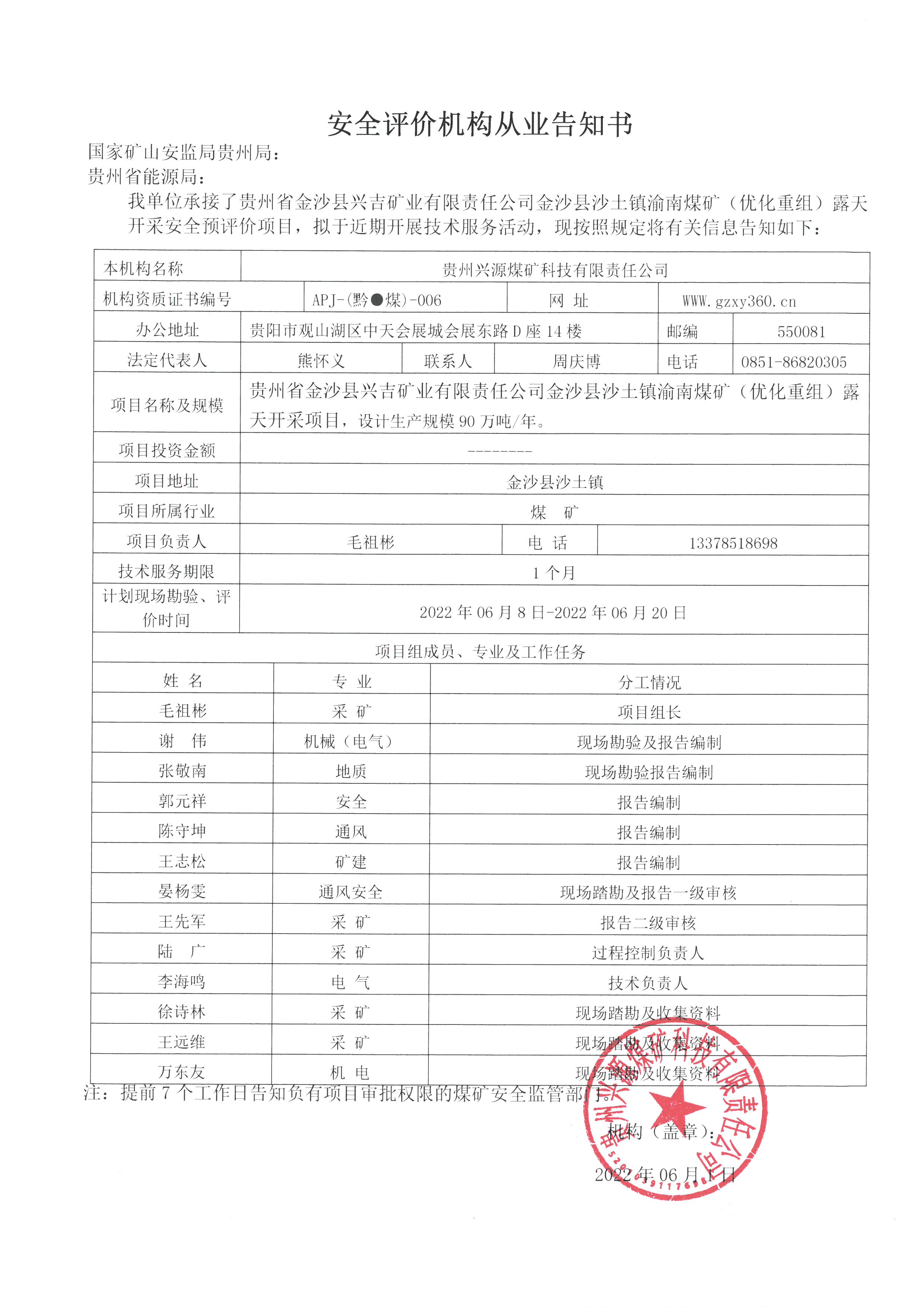 安全評價機構從業(yè)告知書(貴州省金沙縣興吉礦業(yè)有限責任公司金沙縣沙土鎮(zhèn)渝南煤礦(優(yōu)化重組)露天開采安全預評價項目)