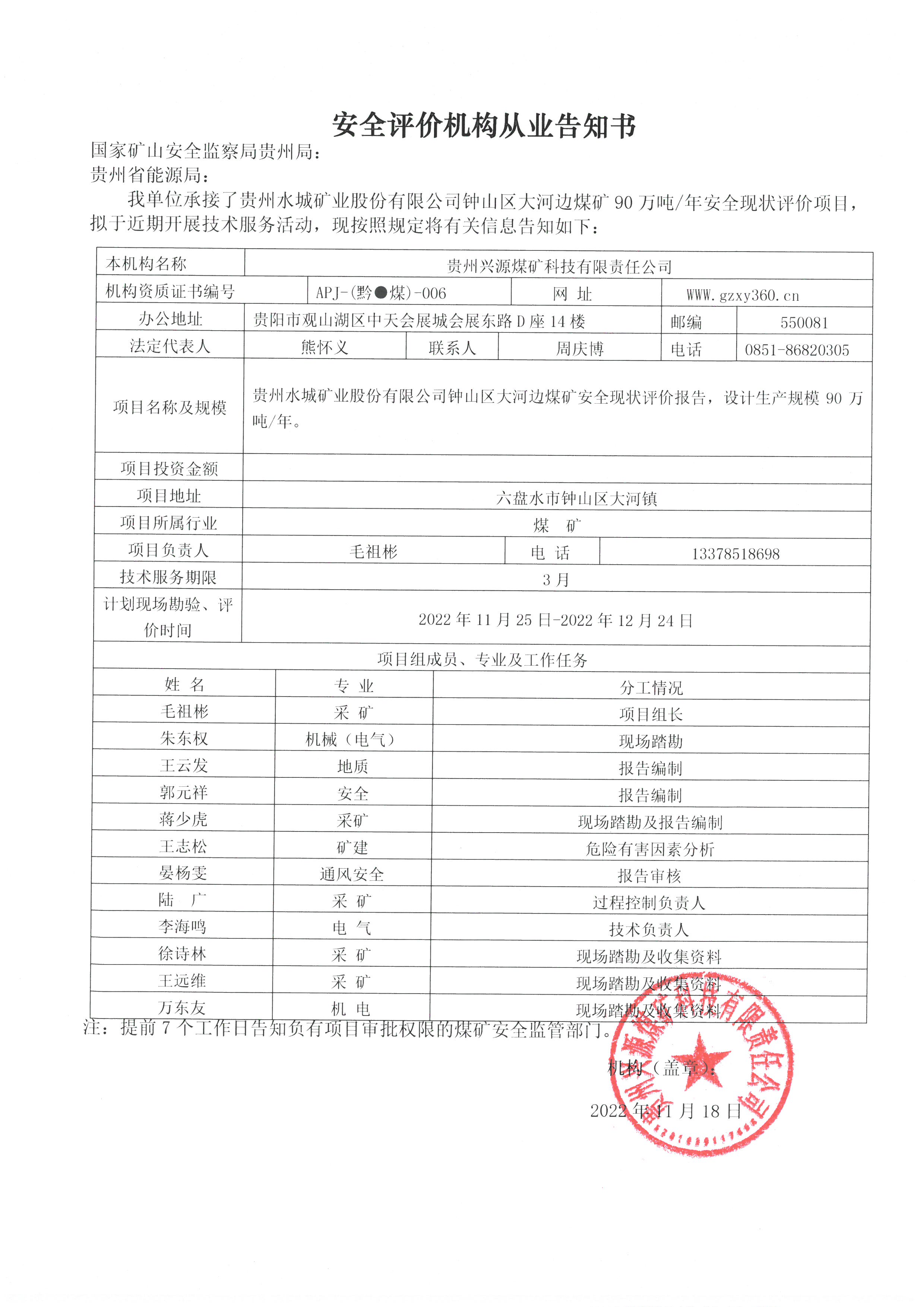 安全評價機構(gòu)從業(yè)告知書【貴州水城礦業(yè)股份有限公司鐘山區(qū)大河邊煤礦】