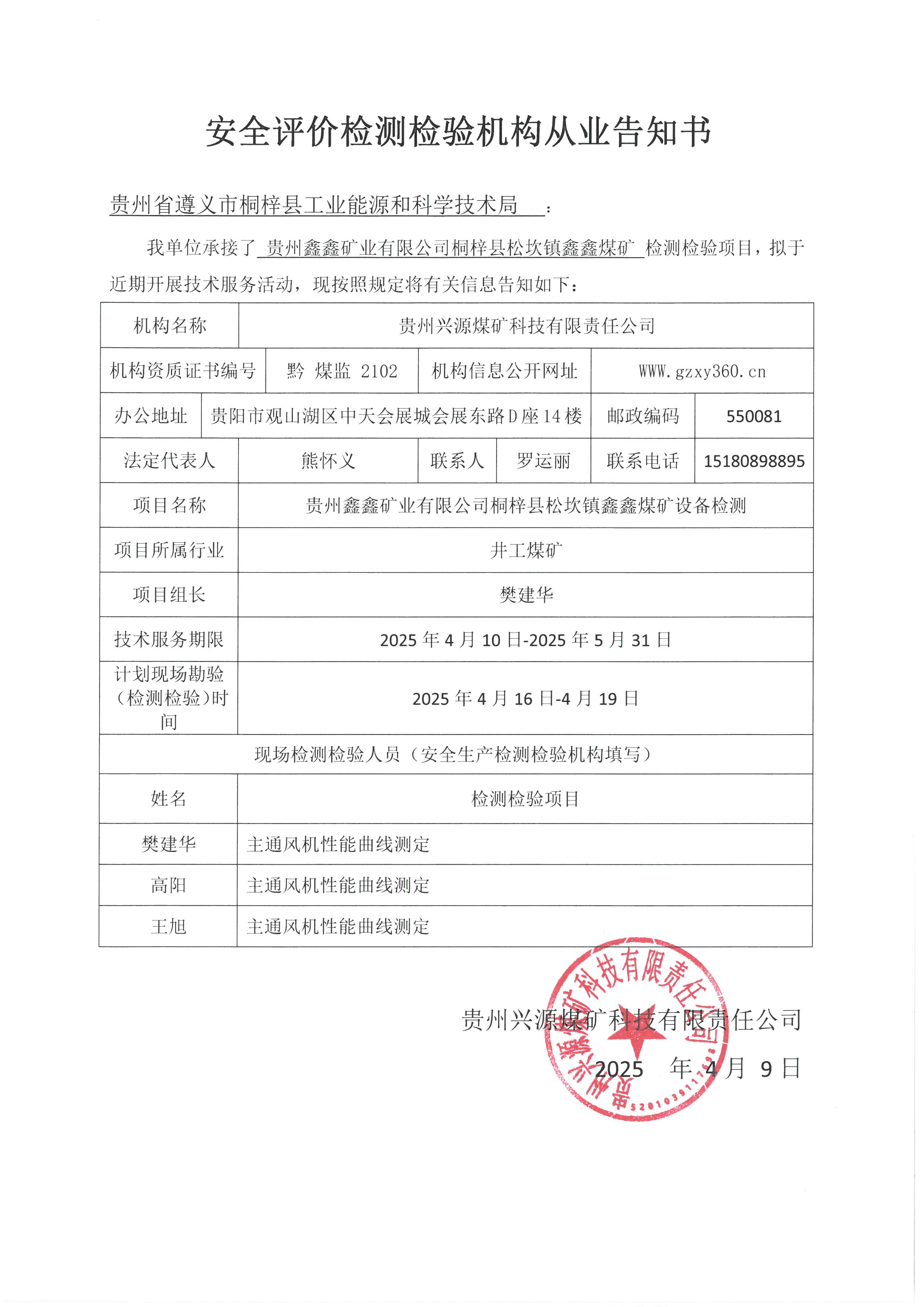 安全評價檢測檢驗機構(gòu)從業(yè)告知書【貴州鑫鑫礦業(yè)有限公司桐梓縣松坎鎮(zhèn)鑫鑫煤礦】