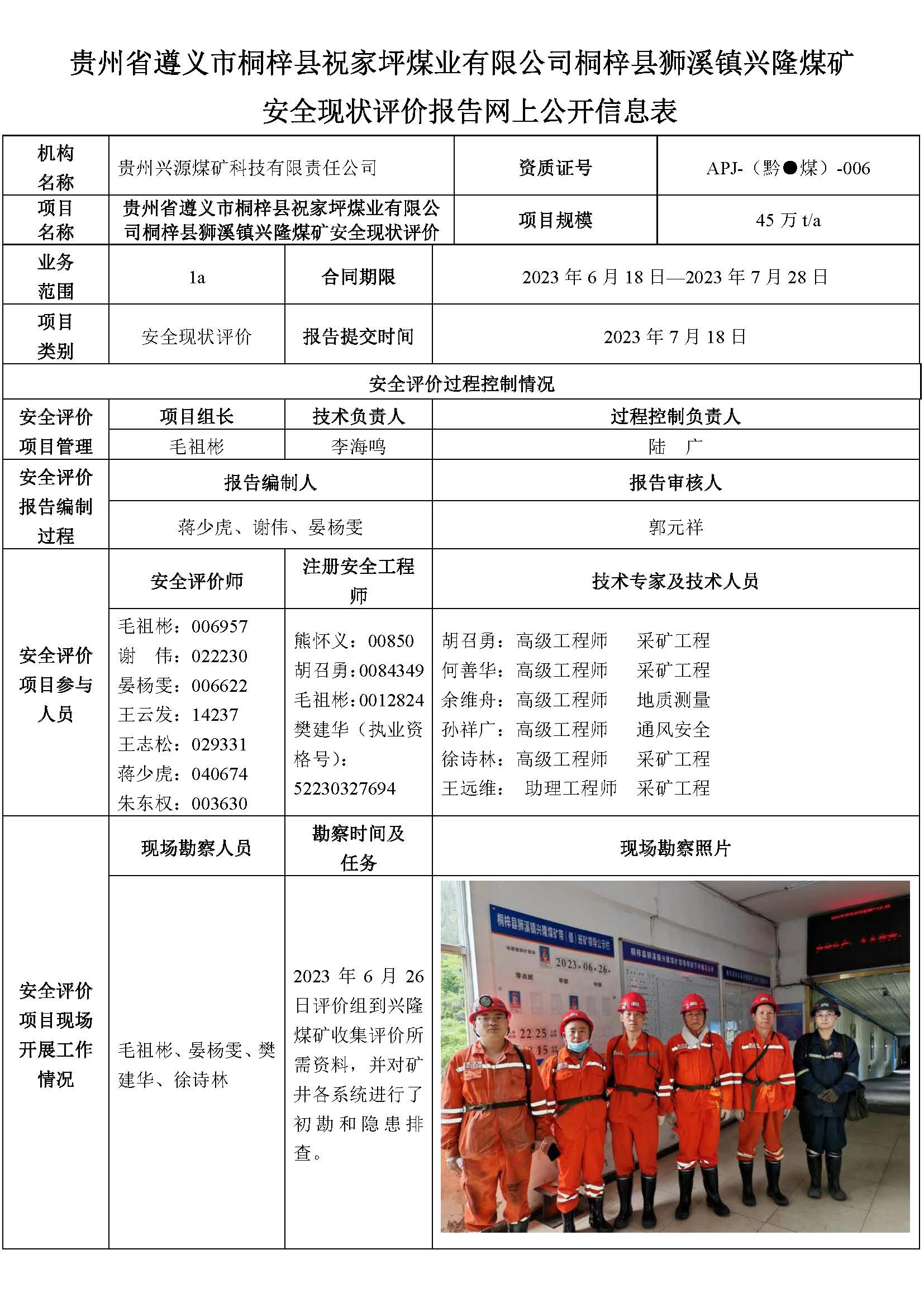 貴州省遵義市桐梓縣祝家坪煤業(yè)有限公司桐梓縣獅溪鎮(zhèn)興隆煤礦 安全現(xiàn)狀評(píng)價(jià)報(bào)告網(wǎng)上公開(kāi)信息表