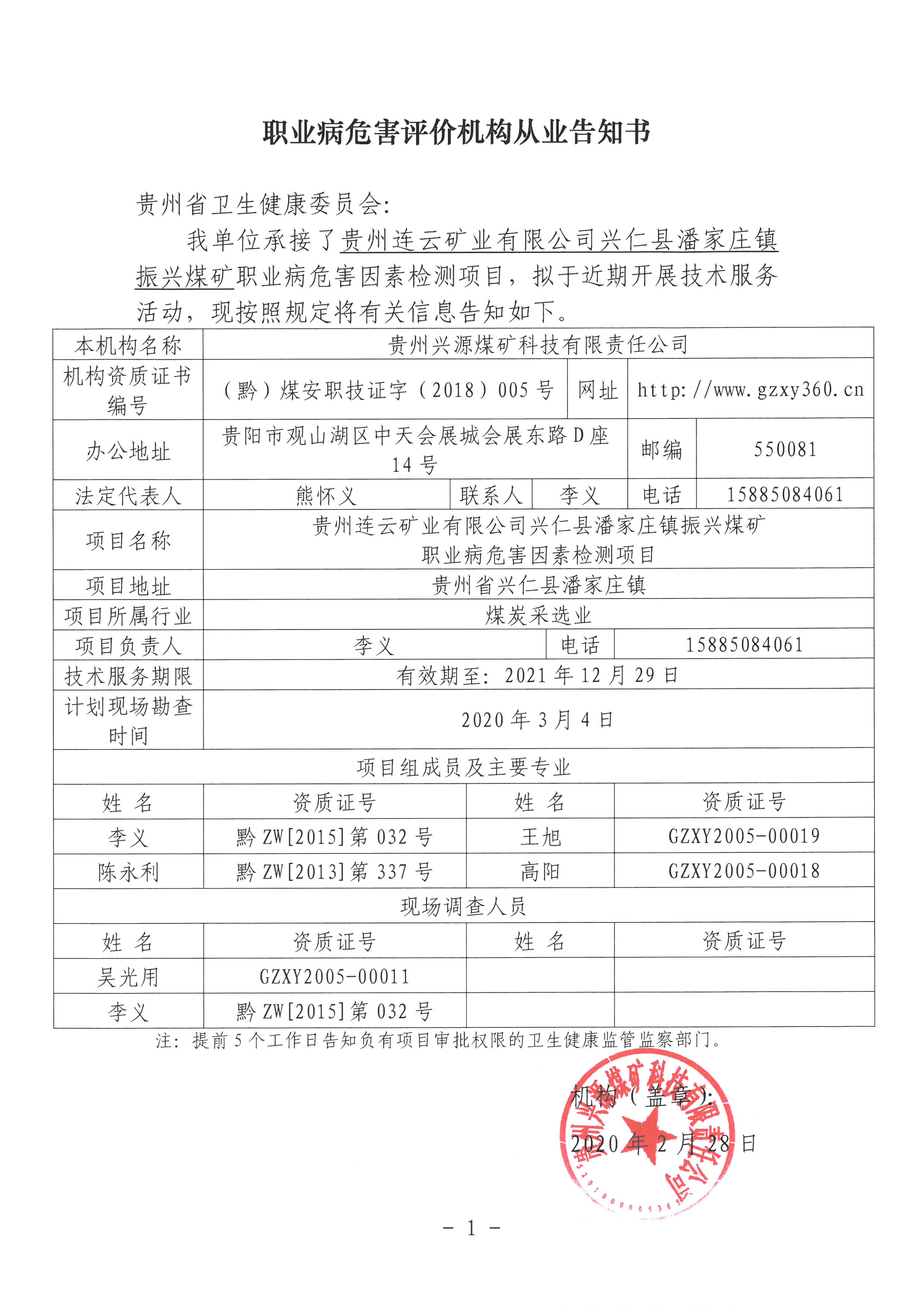 職業(yè)病危害評價機(jī)構(gòu)從業(yè)告知書[貴州連云礦業(yè)有限公司興仁縣潘家莊鎮(zhèn)振興煤礦]