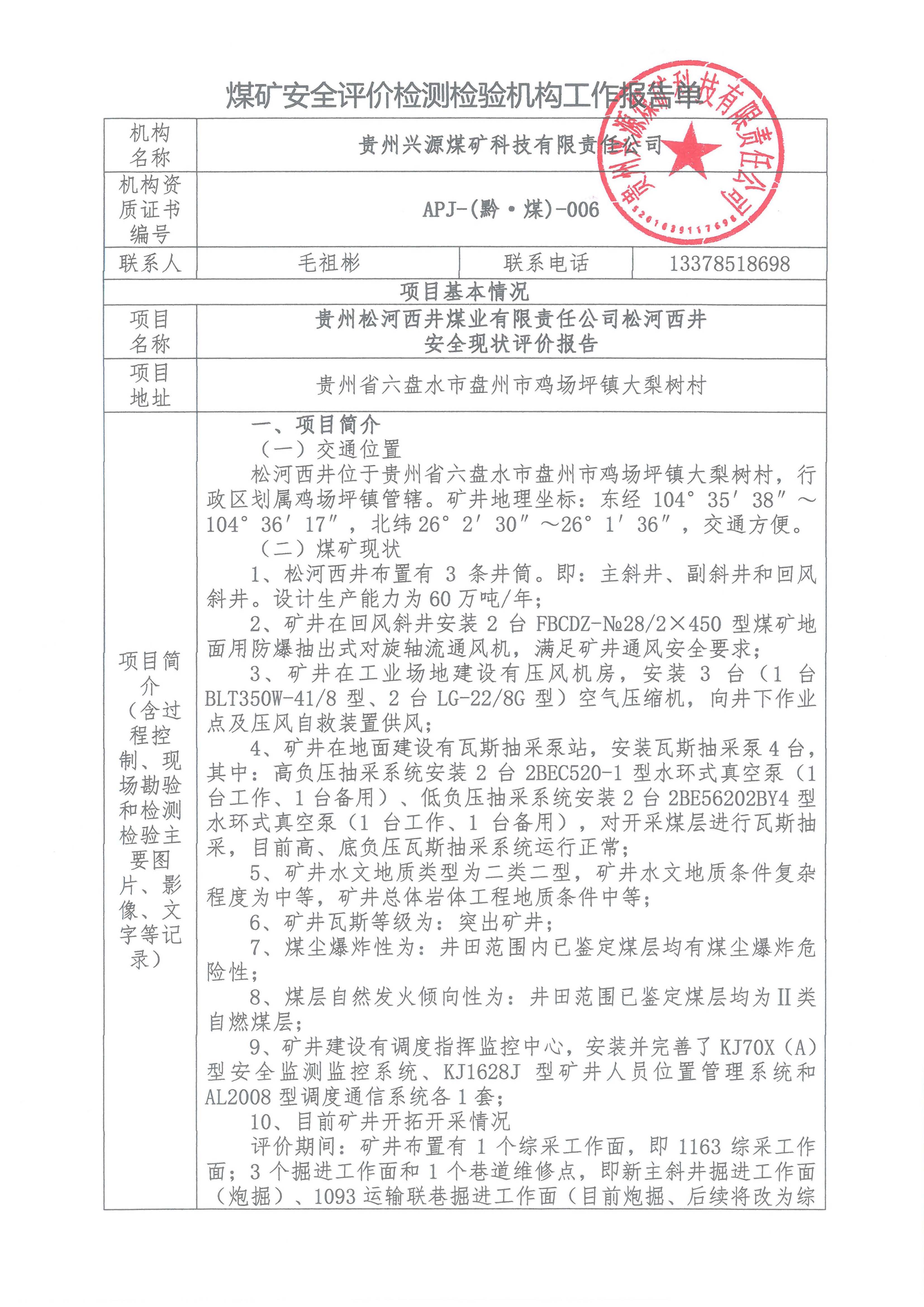 煤礦安全評價檢測檢驗機(jī)構(gòu)工作報告單【貴州松河西井煤業(yè)有限責(zé)任公司松河西井 安全現(xiàn)狀評價報告】